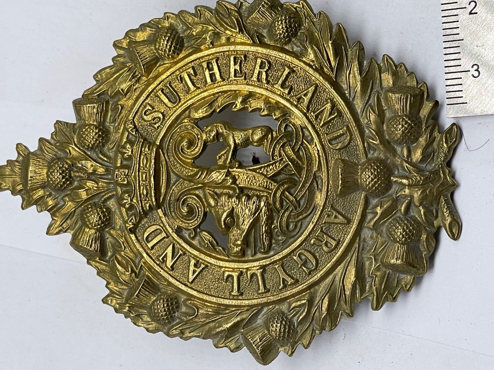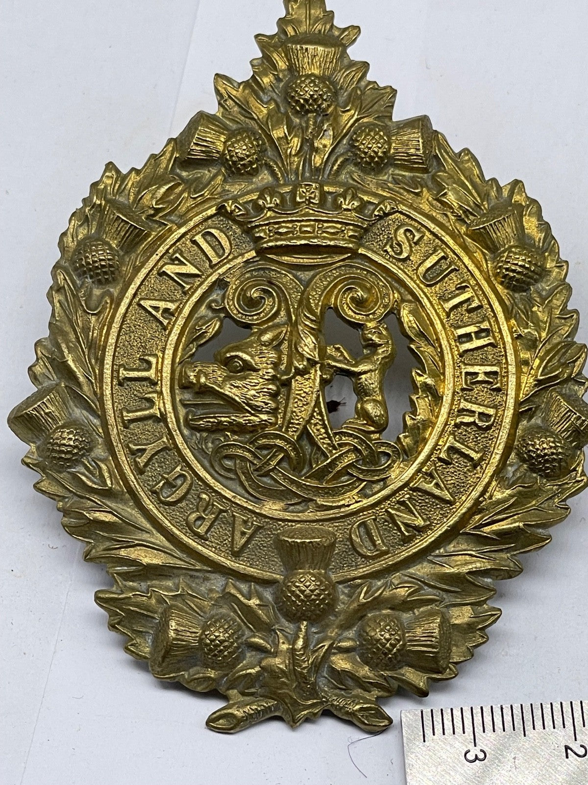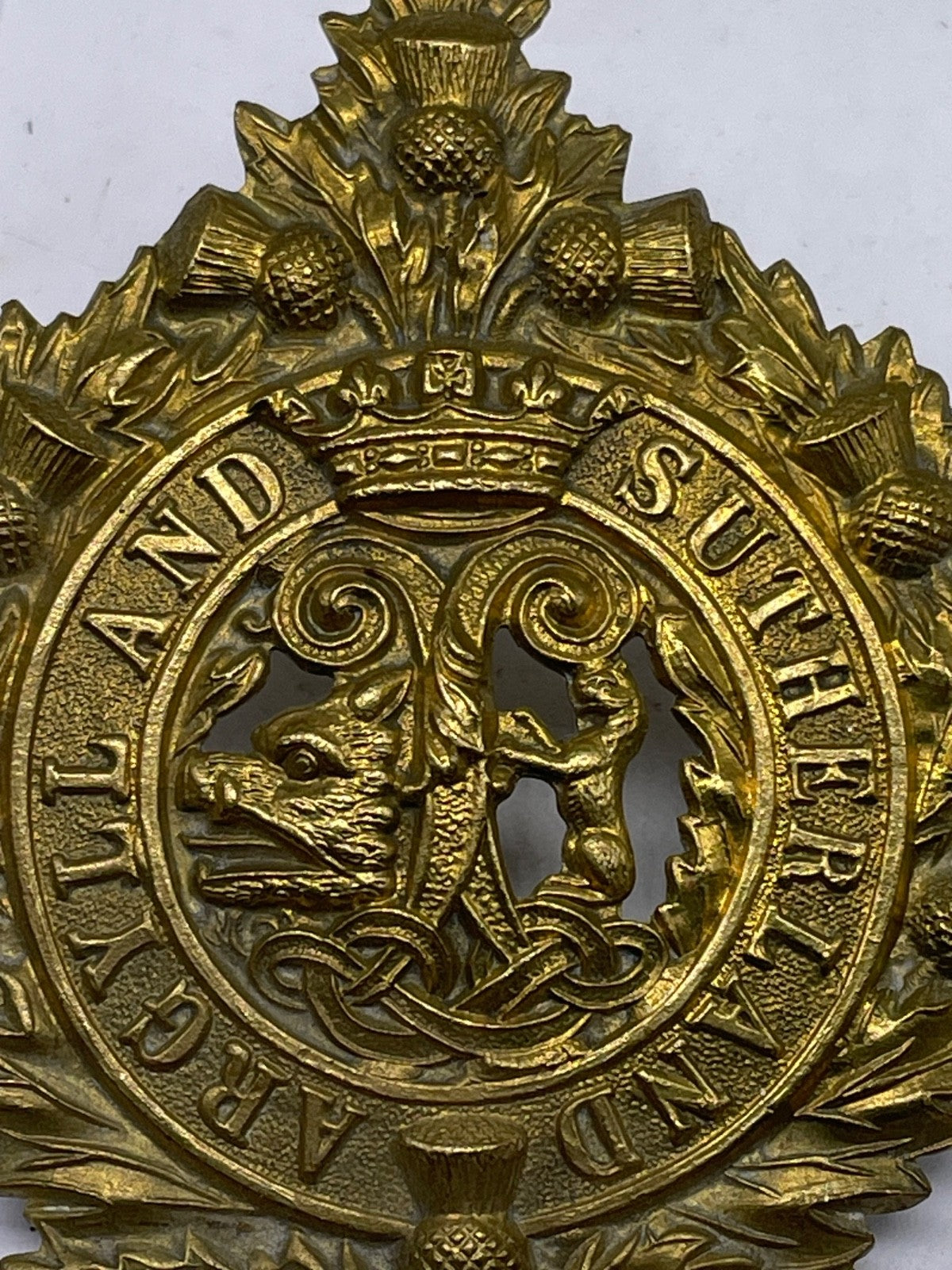Argyll & Sutherland Highlanders 1916 Economy Glengarry Cap Badge - Brass / gilt original.
