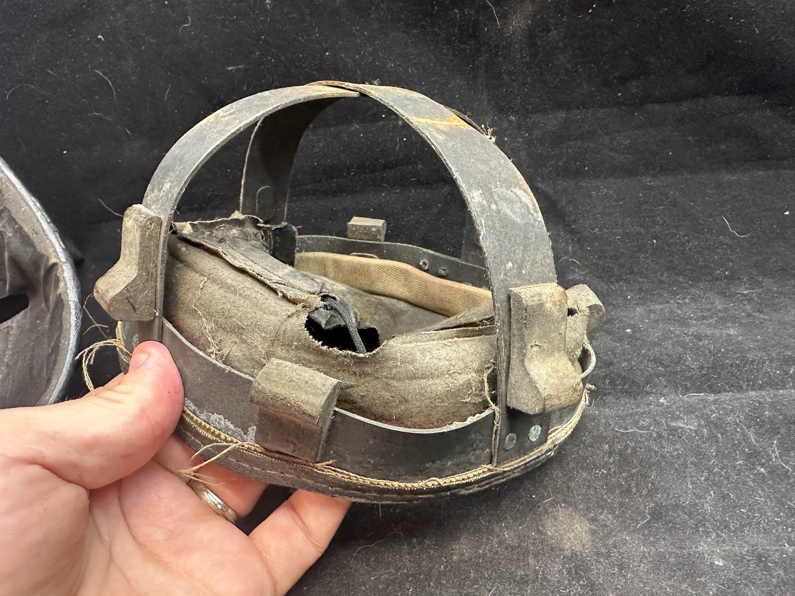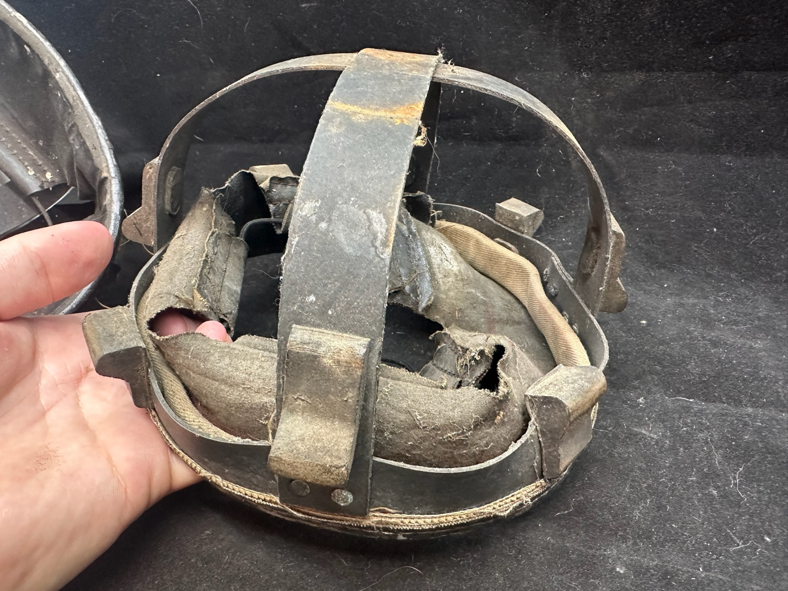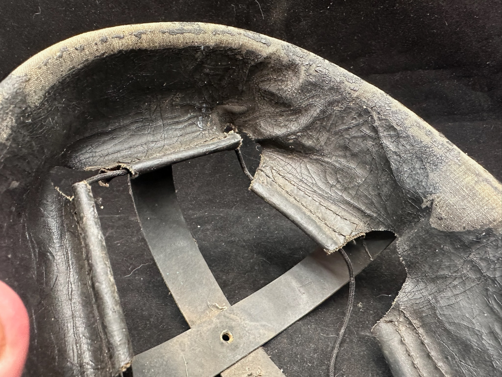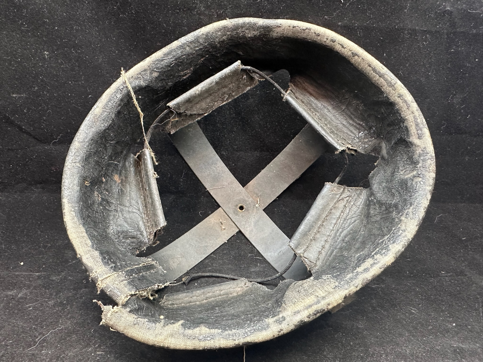 WW2 British Army Helmet Liner - This is a nice original that has been split (Normally to fit someone with a larger head than the listed size) so it could be re-attached, or left as it is.