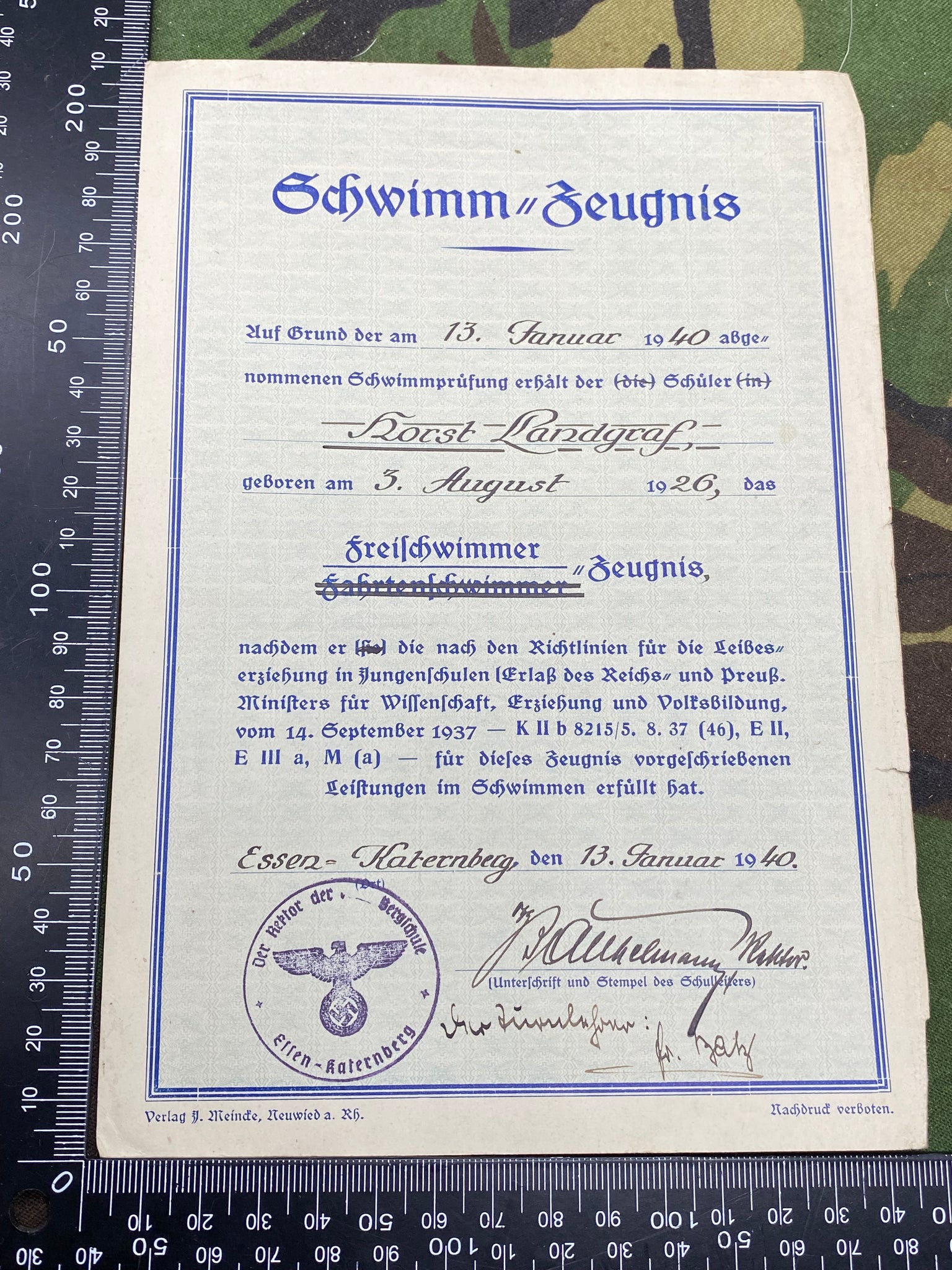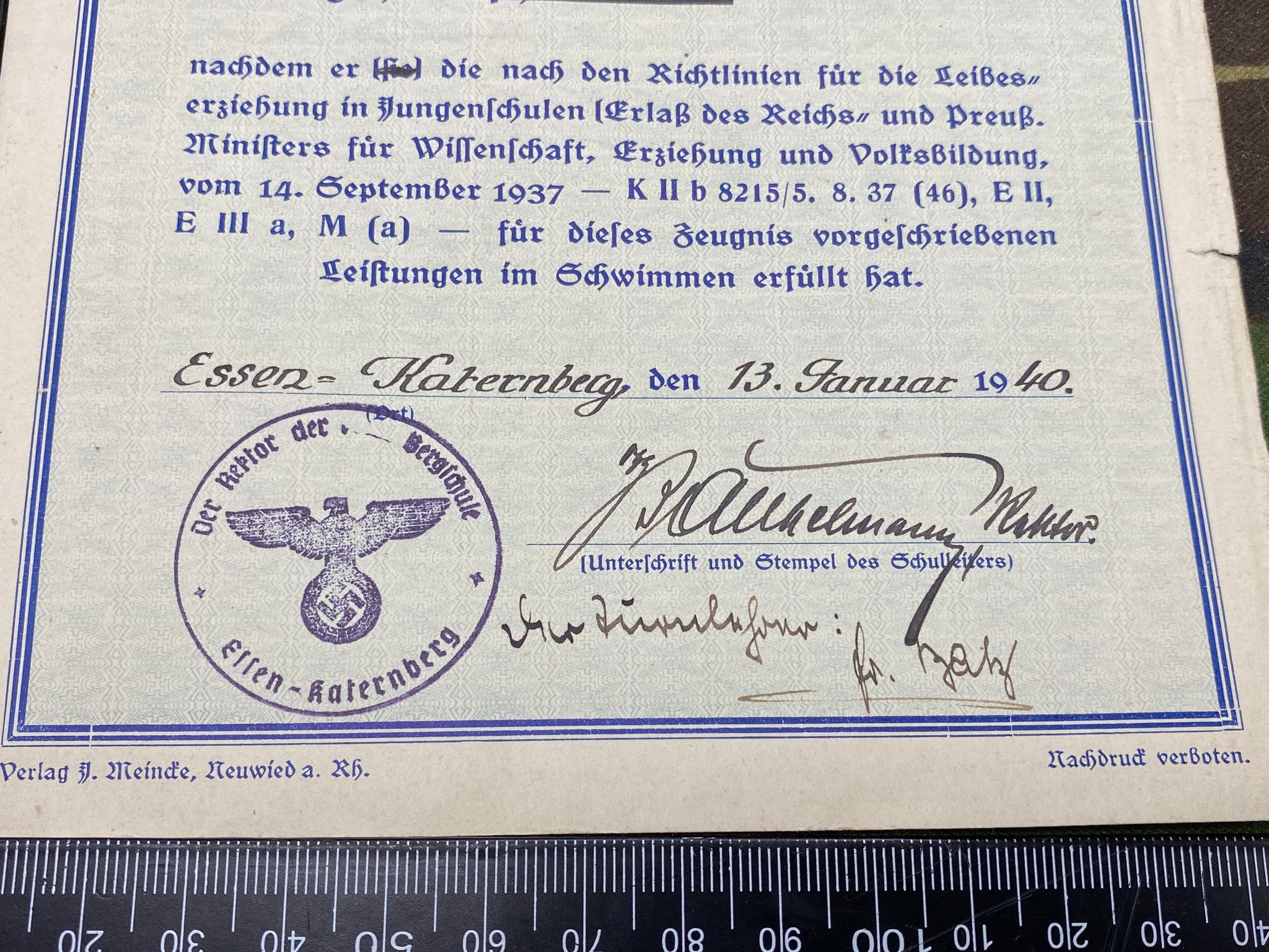 WW2 German Army Signed Swimming Paperwork with signature and good stamp - 1940.