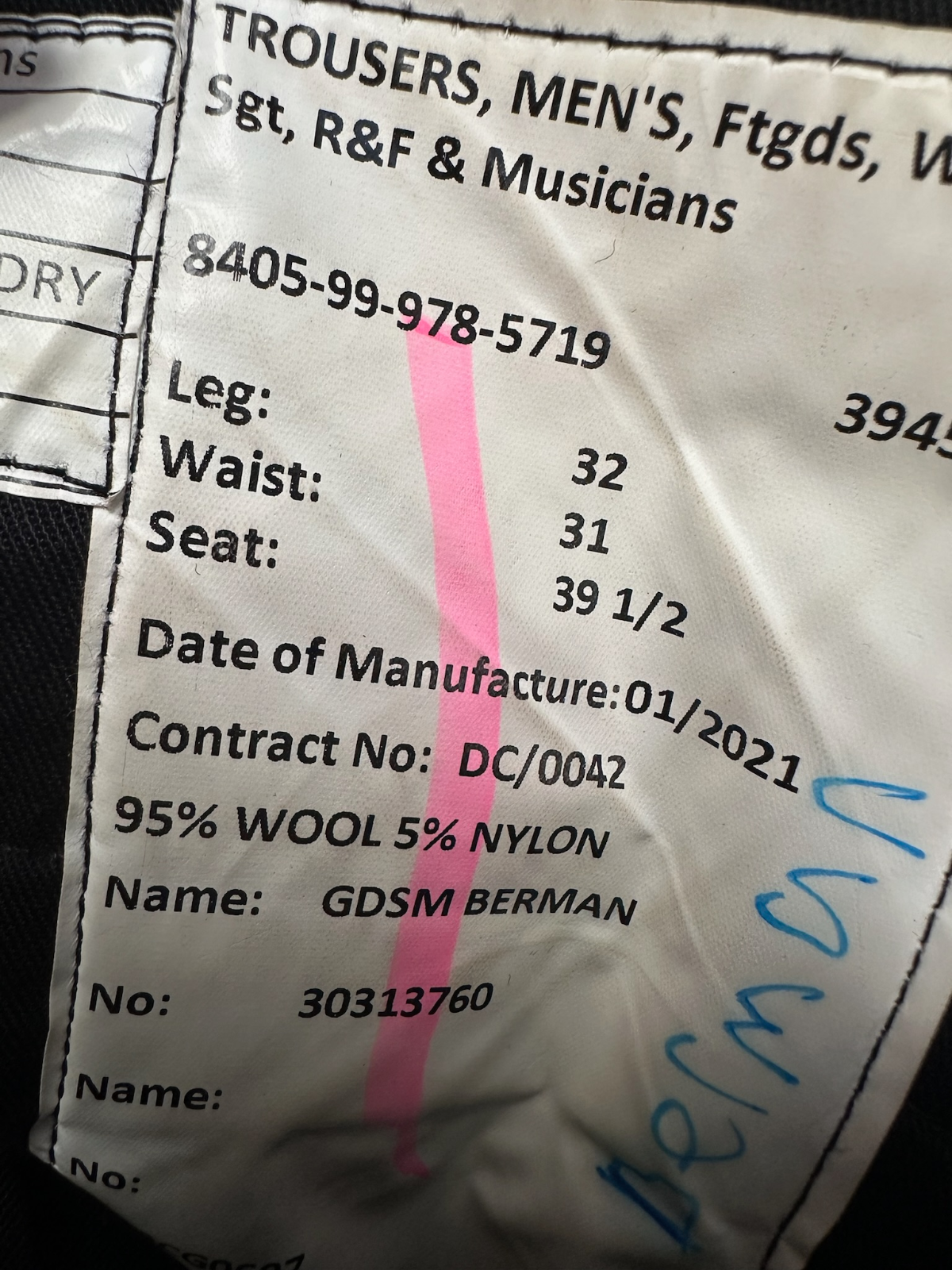 The main photos are of the type of trousers in this listing, the label is showing the exact pair you are buying. All the trousers are in comparable condition, grade 1 from old stores but used. The detailed sizes are shown in the label photos.