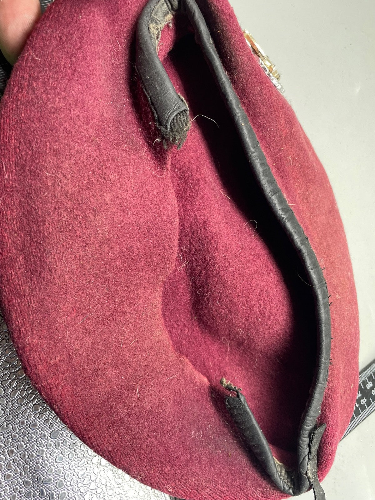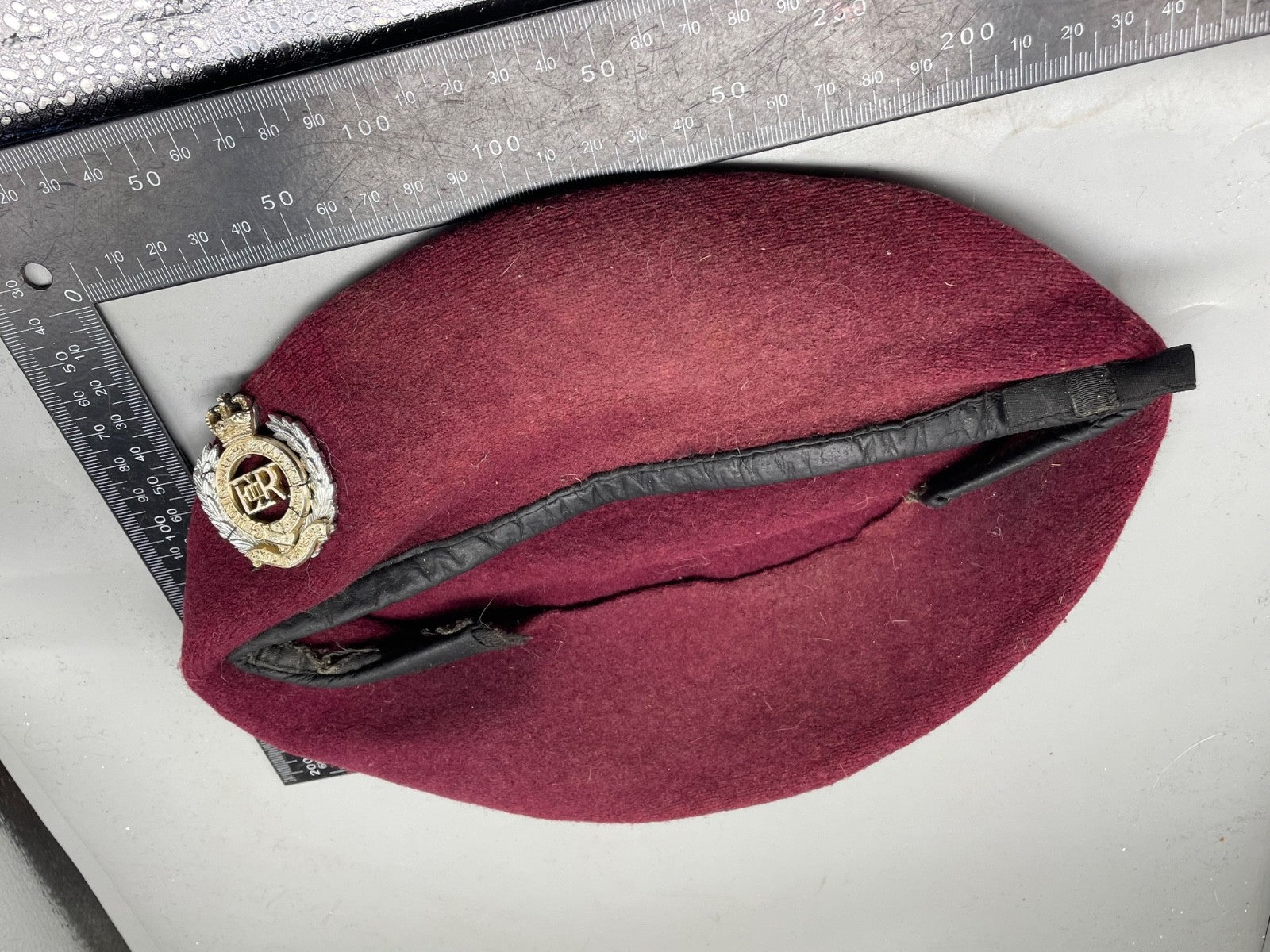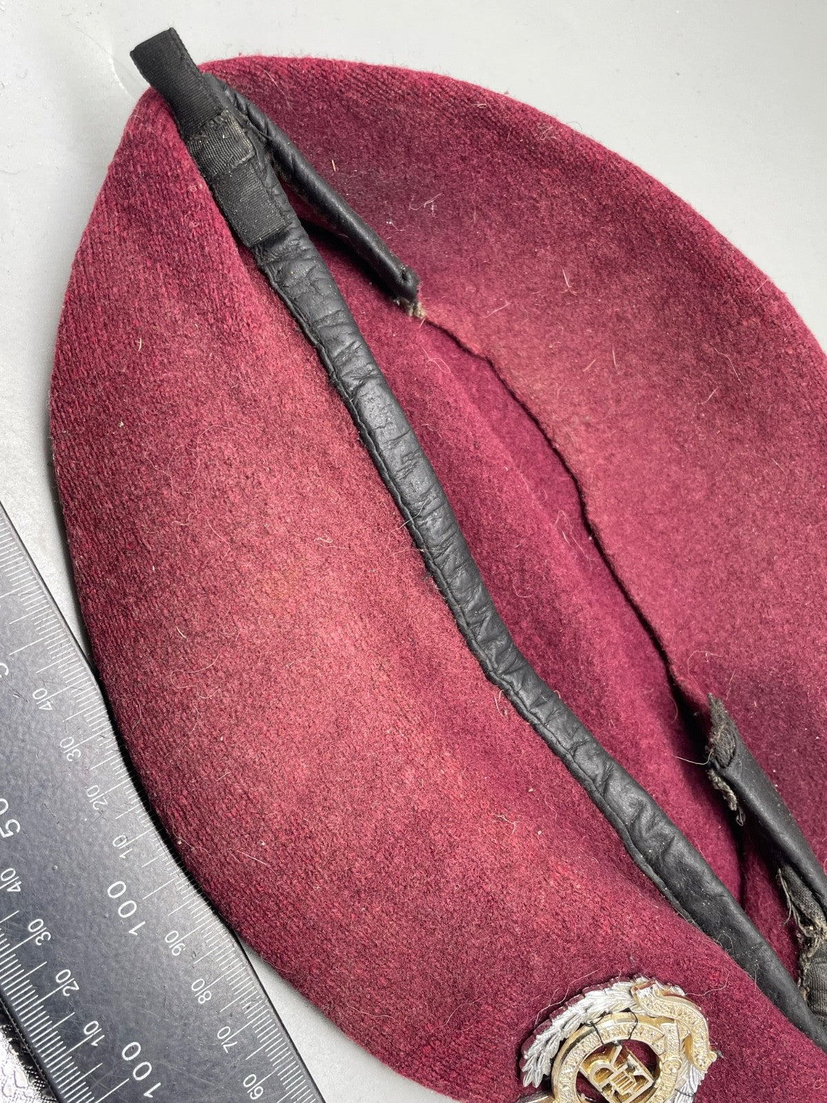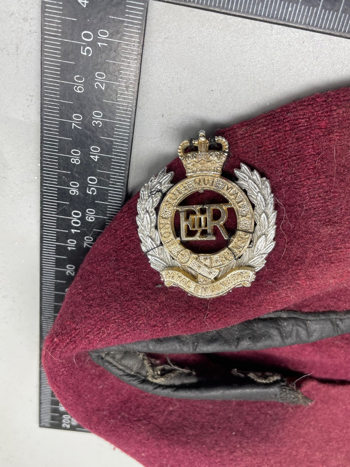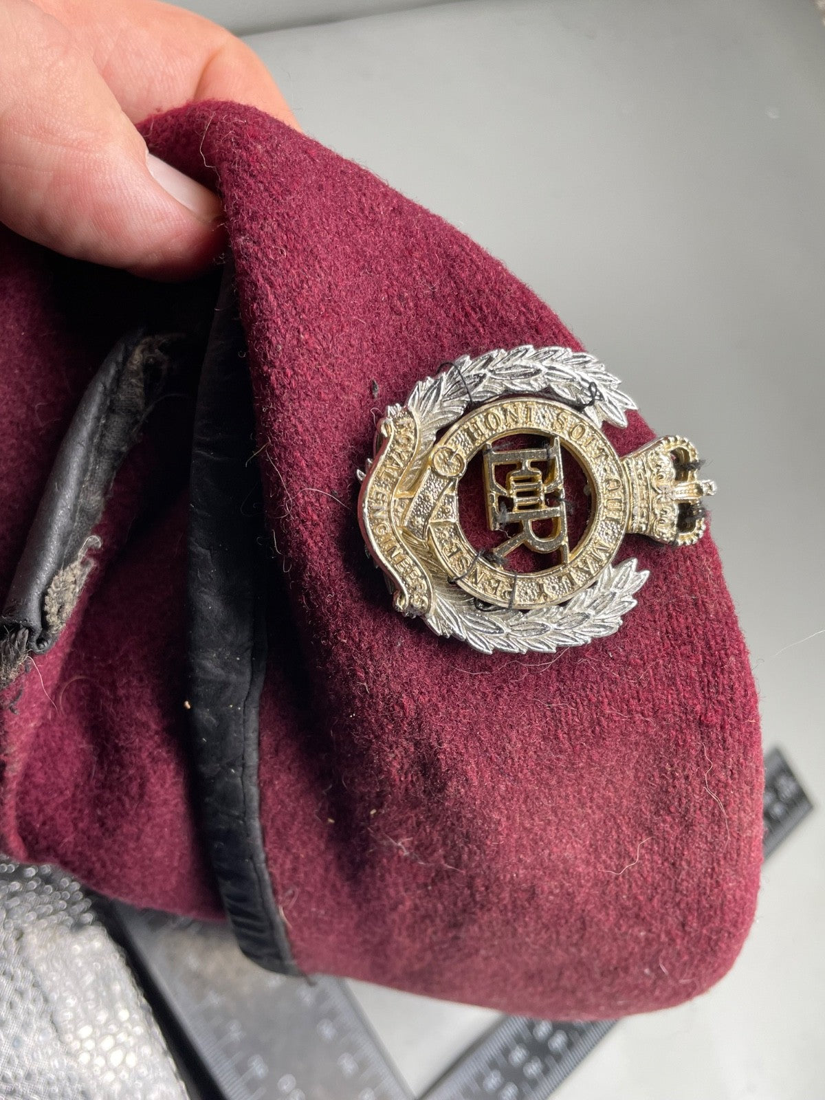 Original British Army Parachute Engineers Beret with Badge.  The trim of the beret is damaged.