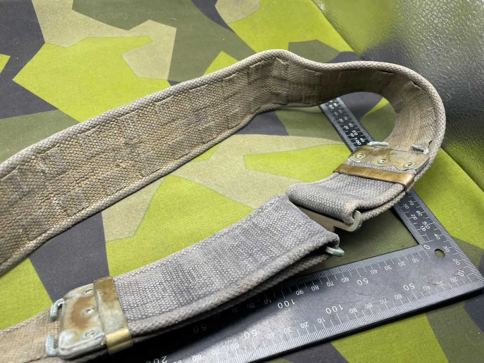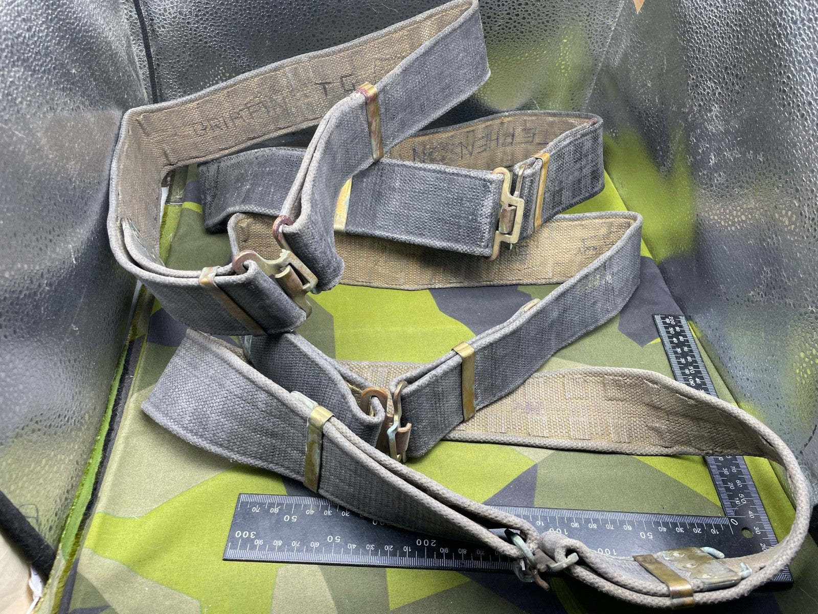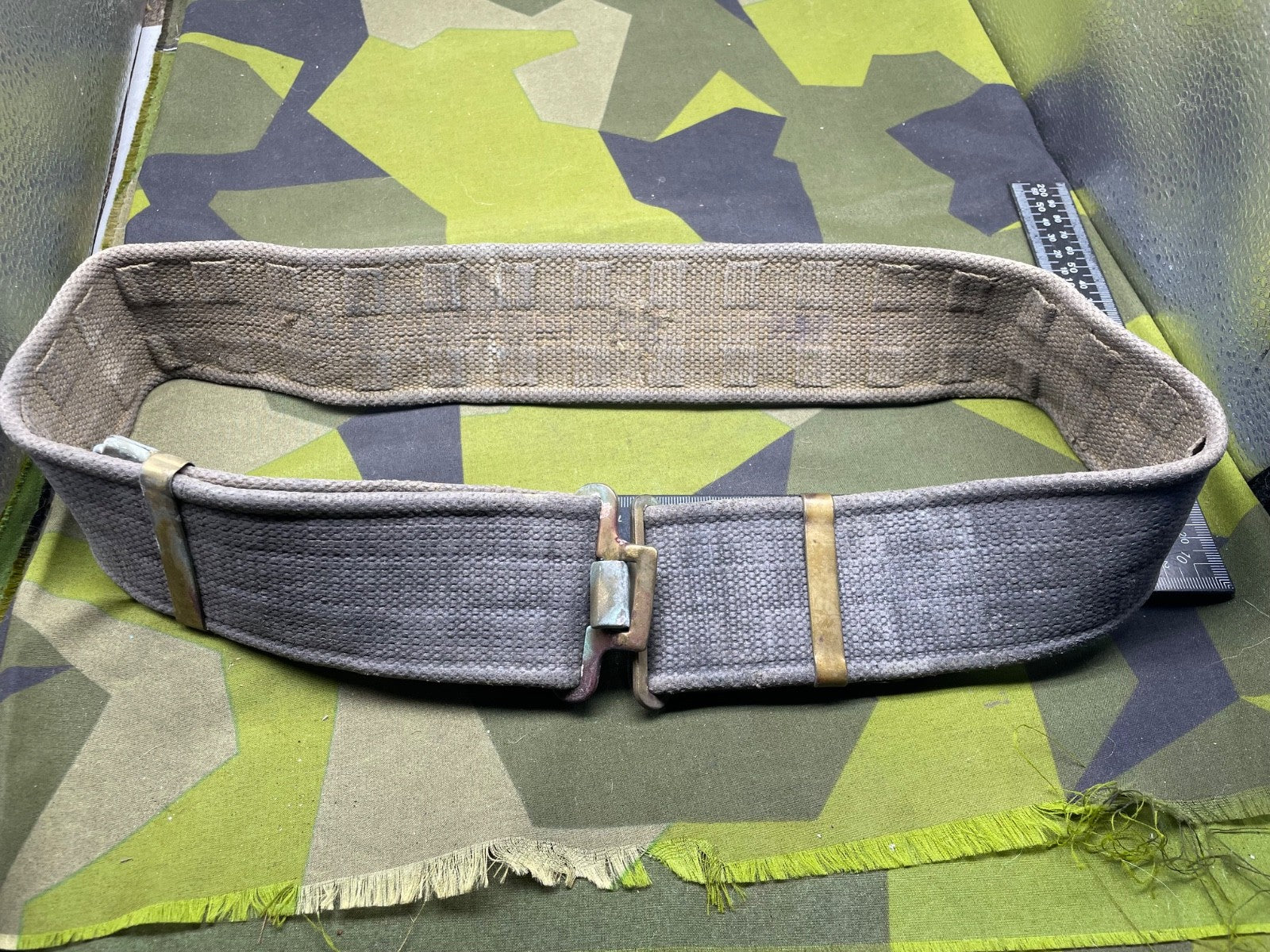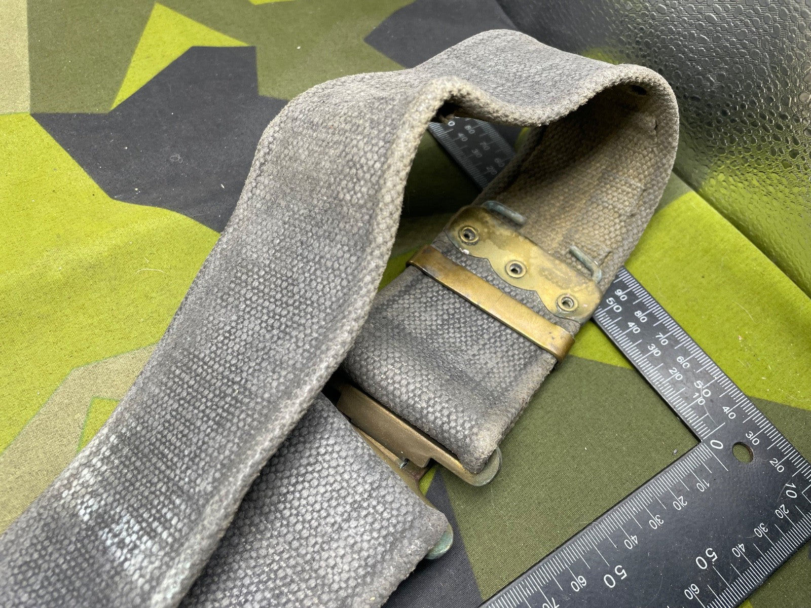 Original WW2 British RAF Blue 37 Pattern Drivers' Webbing Belt - Size 36 Inch Waist. It has had the two rear buckles removed during the war so they did not interfere with the driver when he is sitting down for long periods of time.