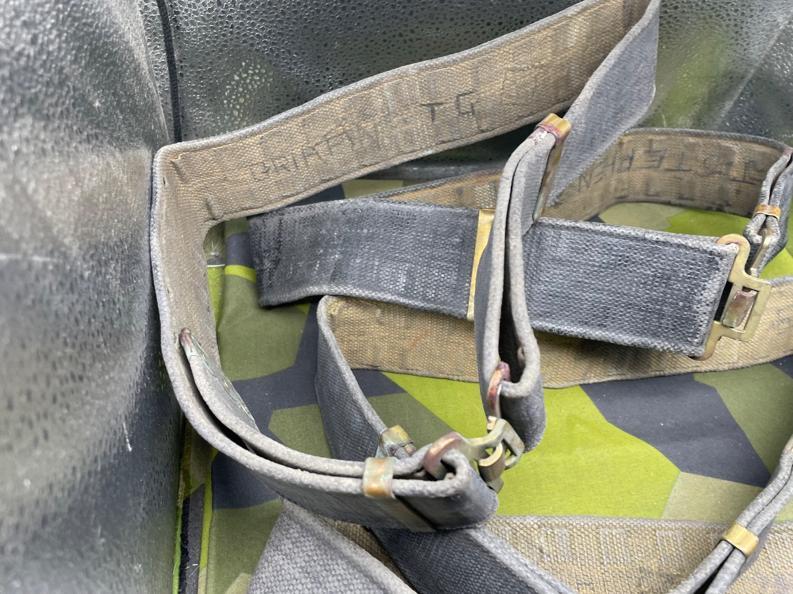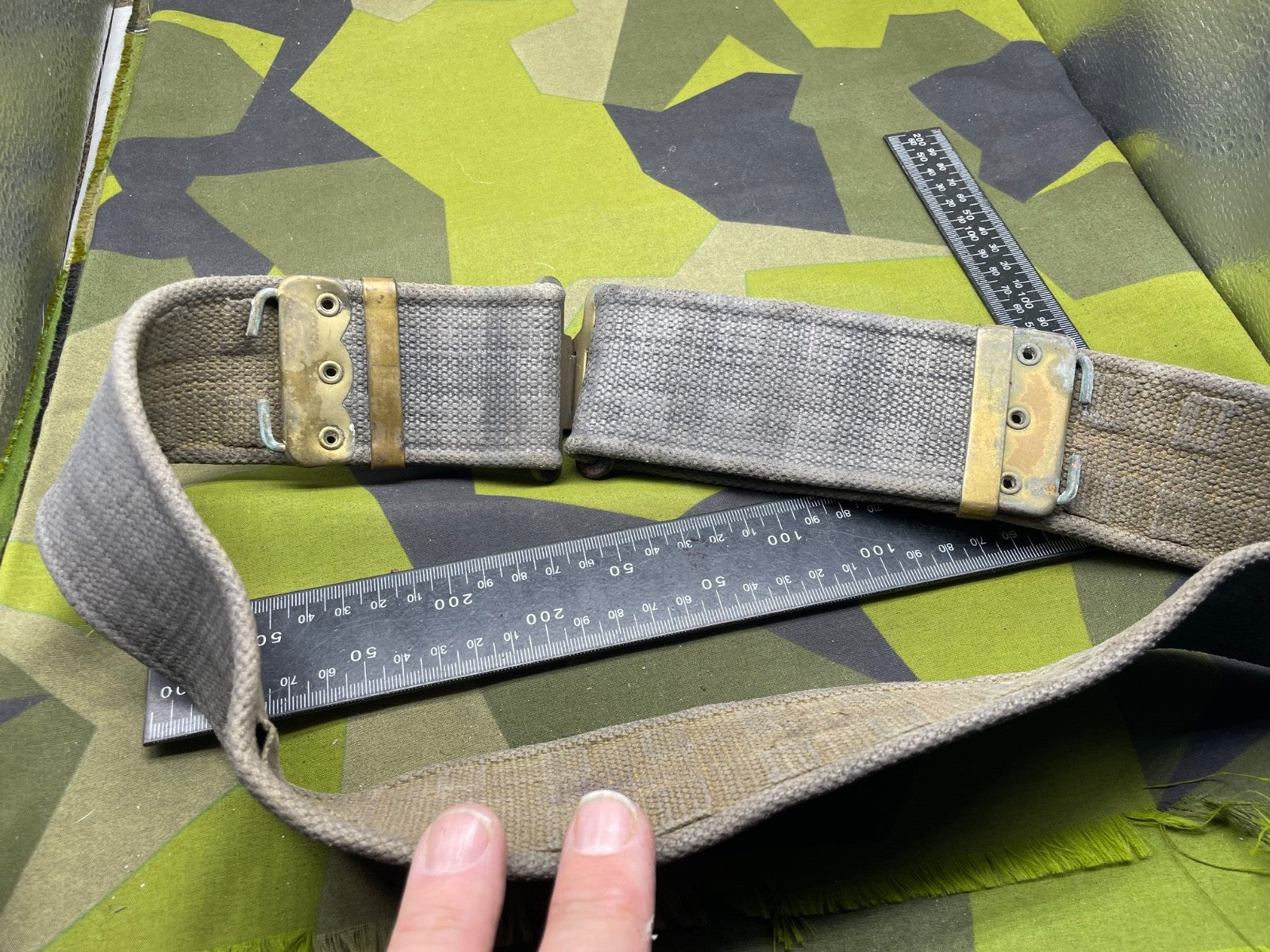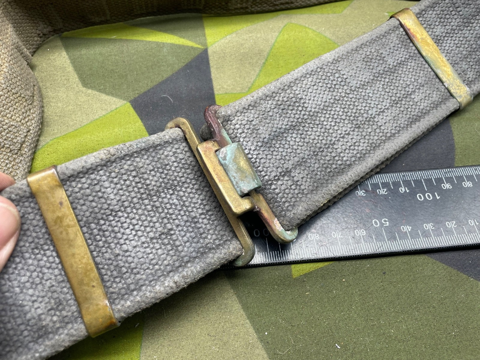 Original WW2 British RAF Blue 37 Pattern Drivers' Webbing Belt - Size 36 Inch Waist. It has had the two rear buckles removed during the war so they did not interfere with the driver when he is sitting down for long periods of time.