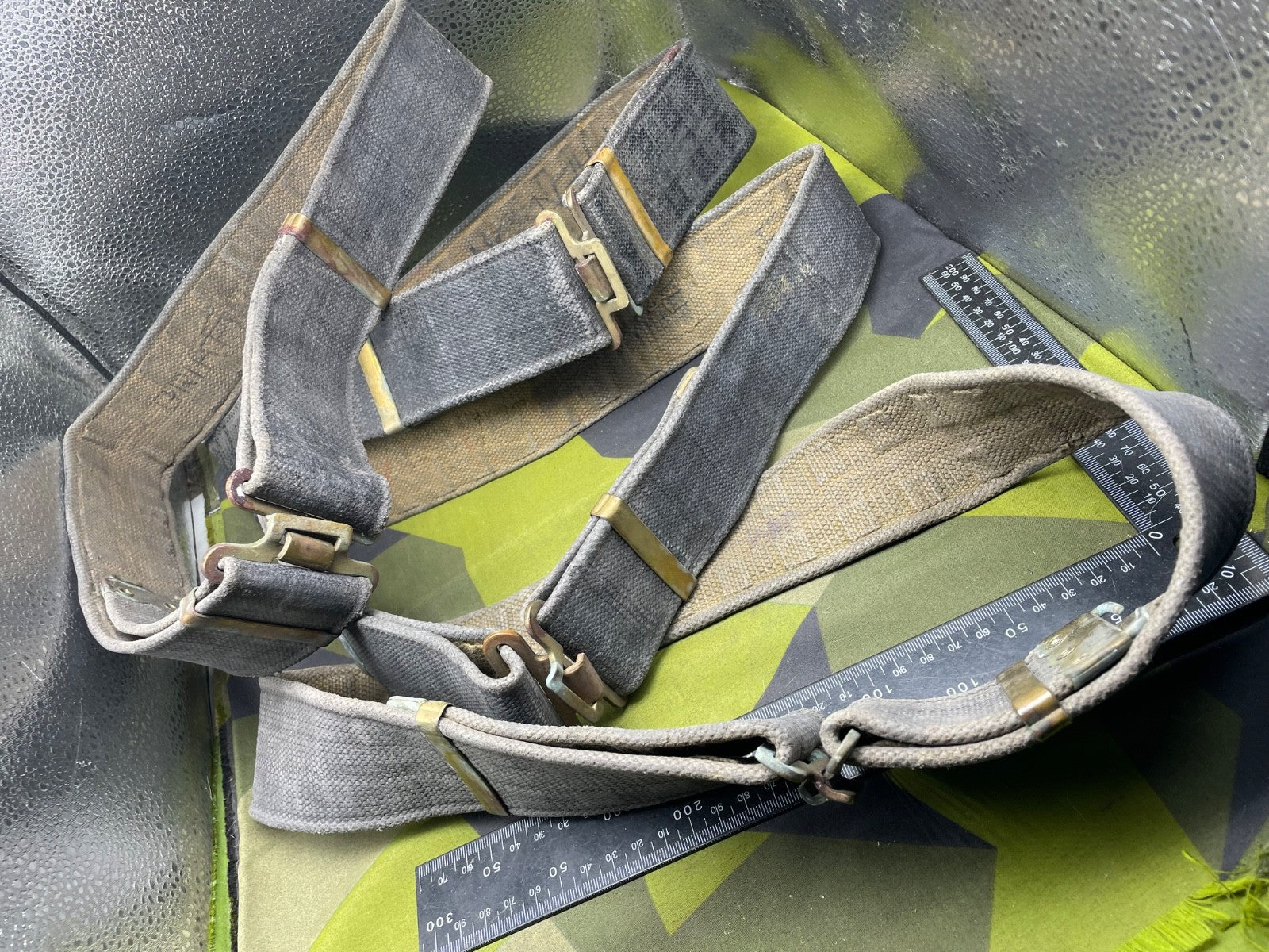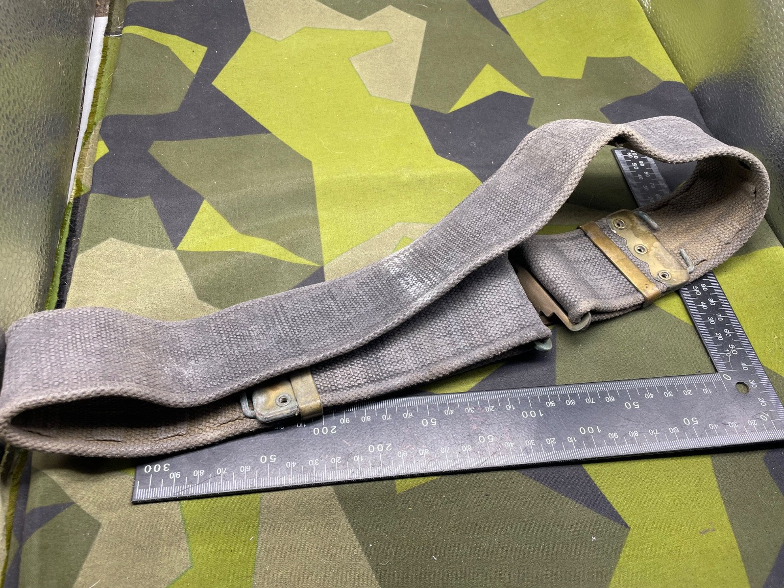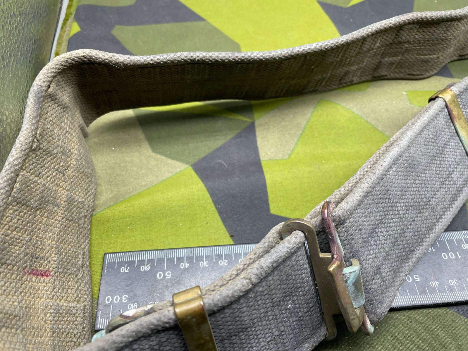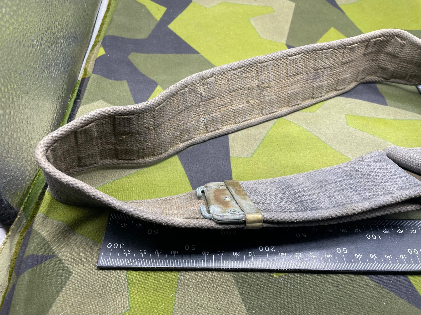 Original WW2 British RAF Blue 37 Pattern Drivers' Webbing Belt - Size 36 Inch Waist. It has had the two rear buckles removed during the war so they did not interfere with the driver when he is sitting down for long periods of time.
