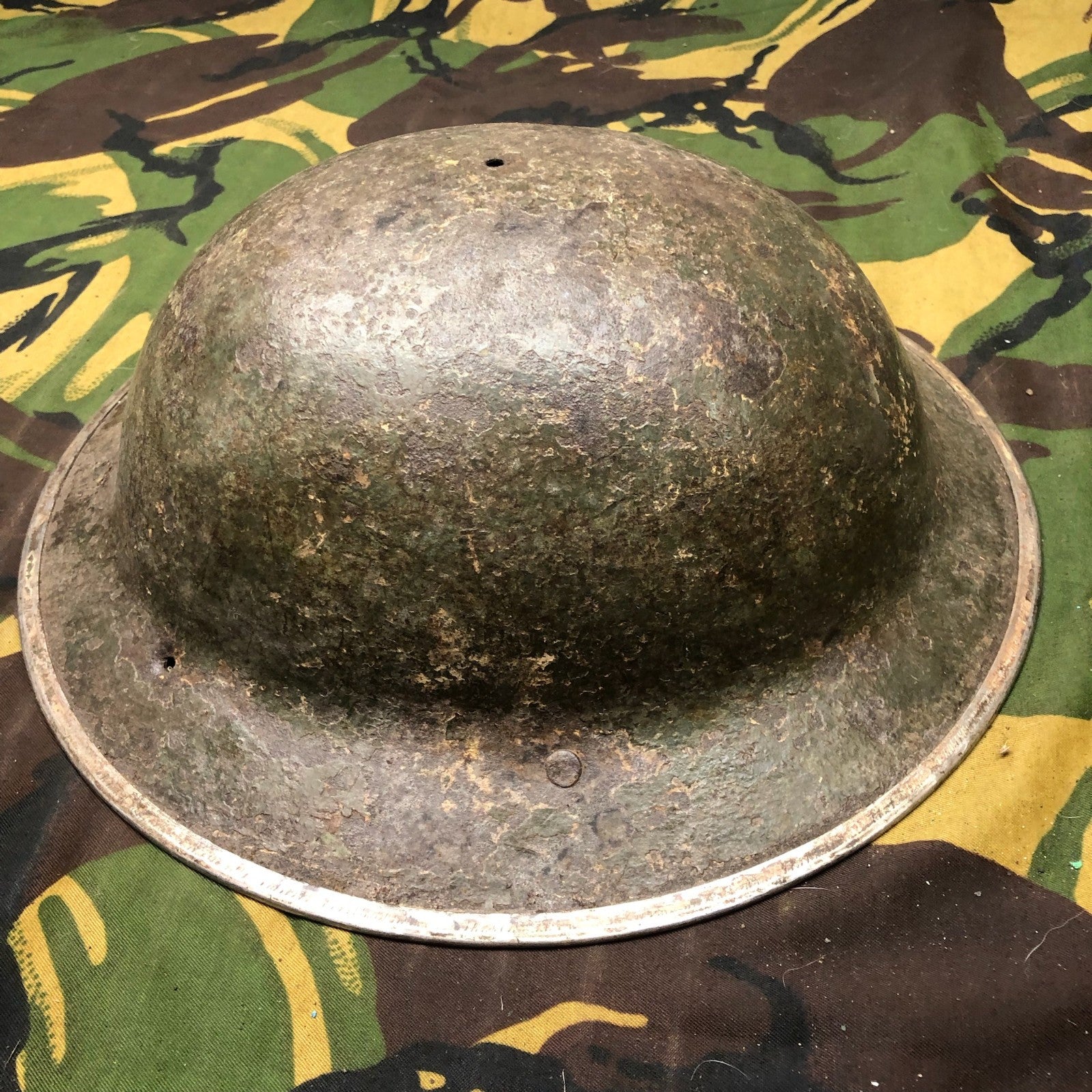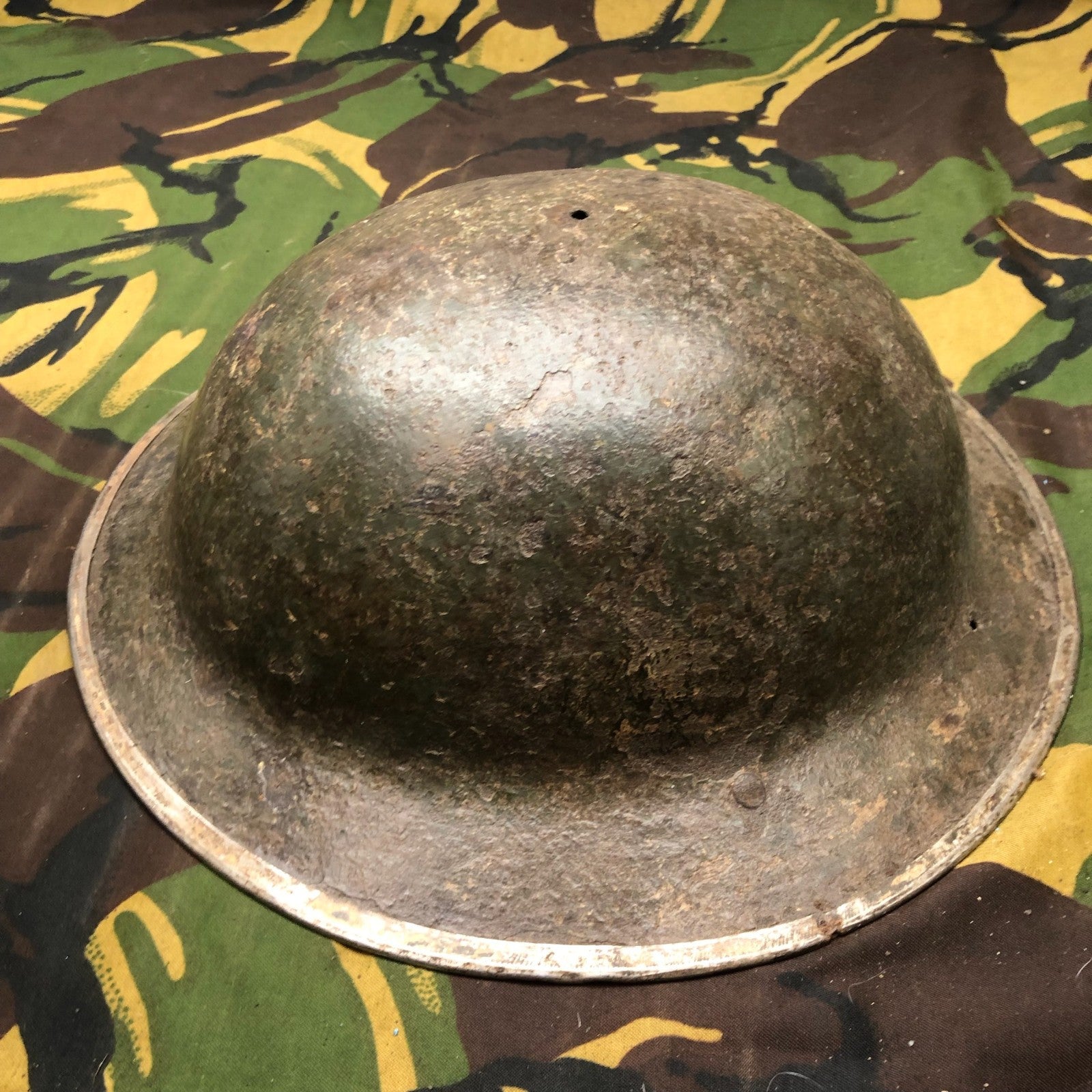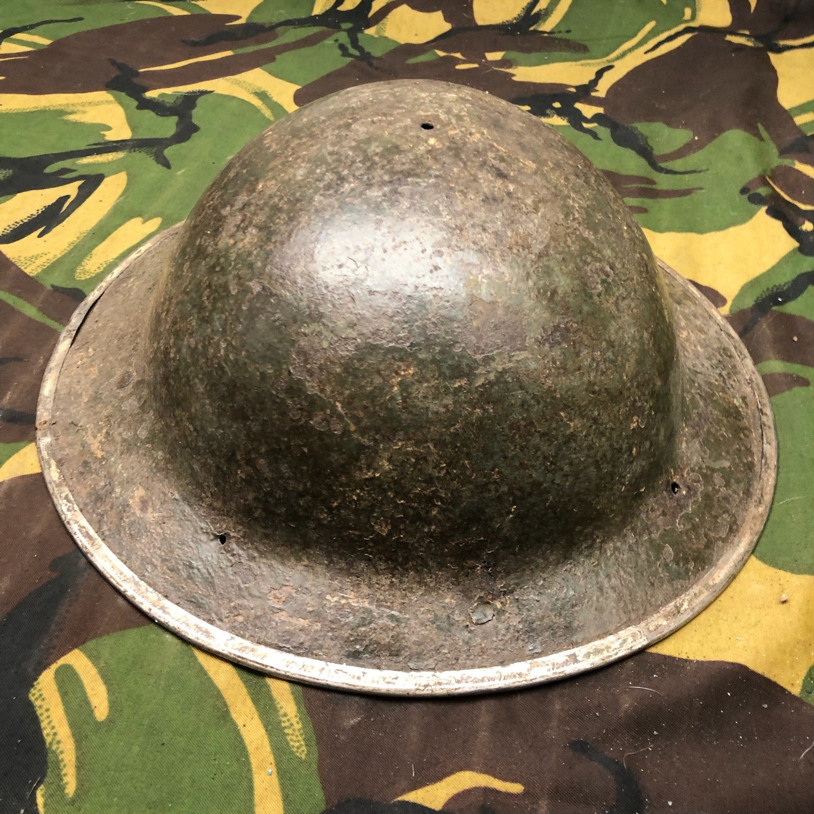 Original WW2 British Army Mk2 Brodie Combat Helmet - This example was produced in South Africa and has the 3 holes around the edge for the sun visor.
