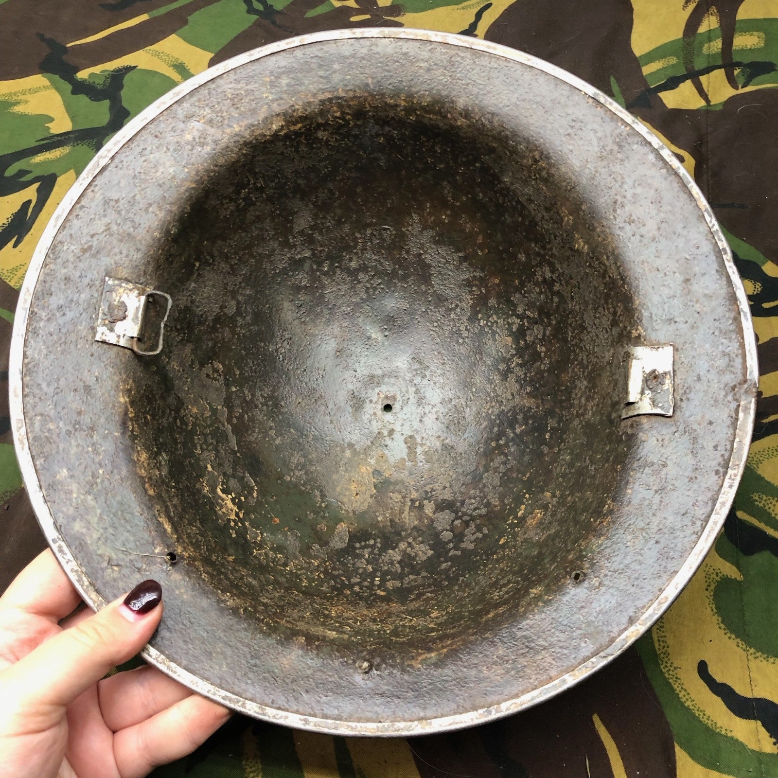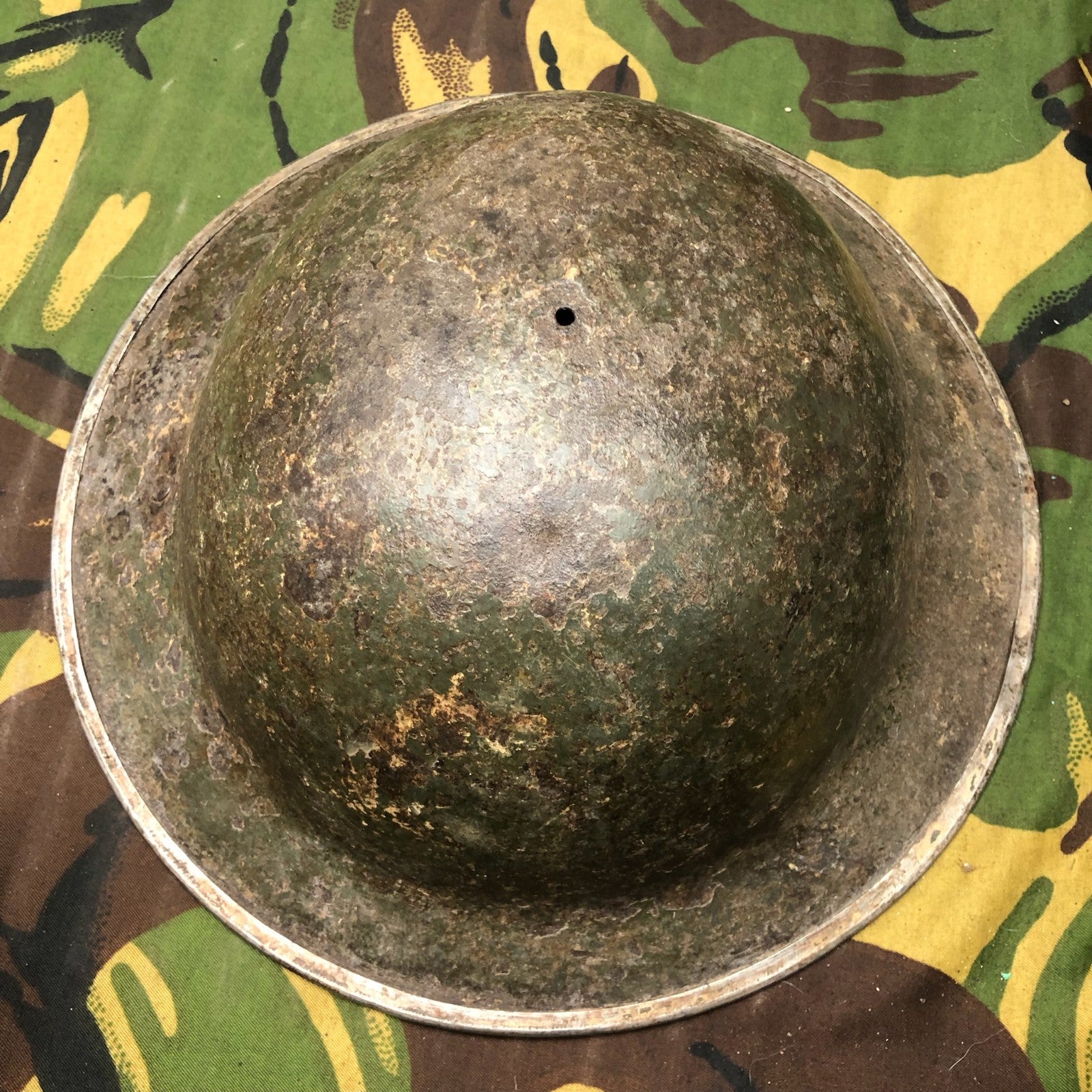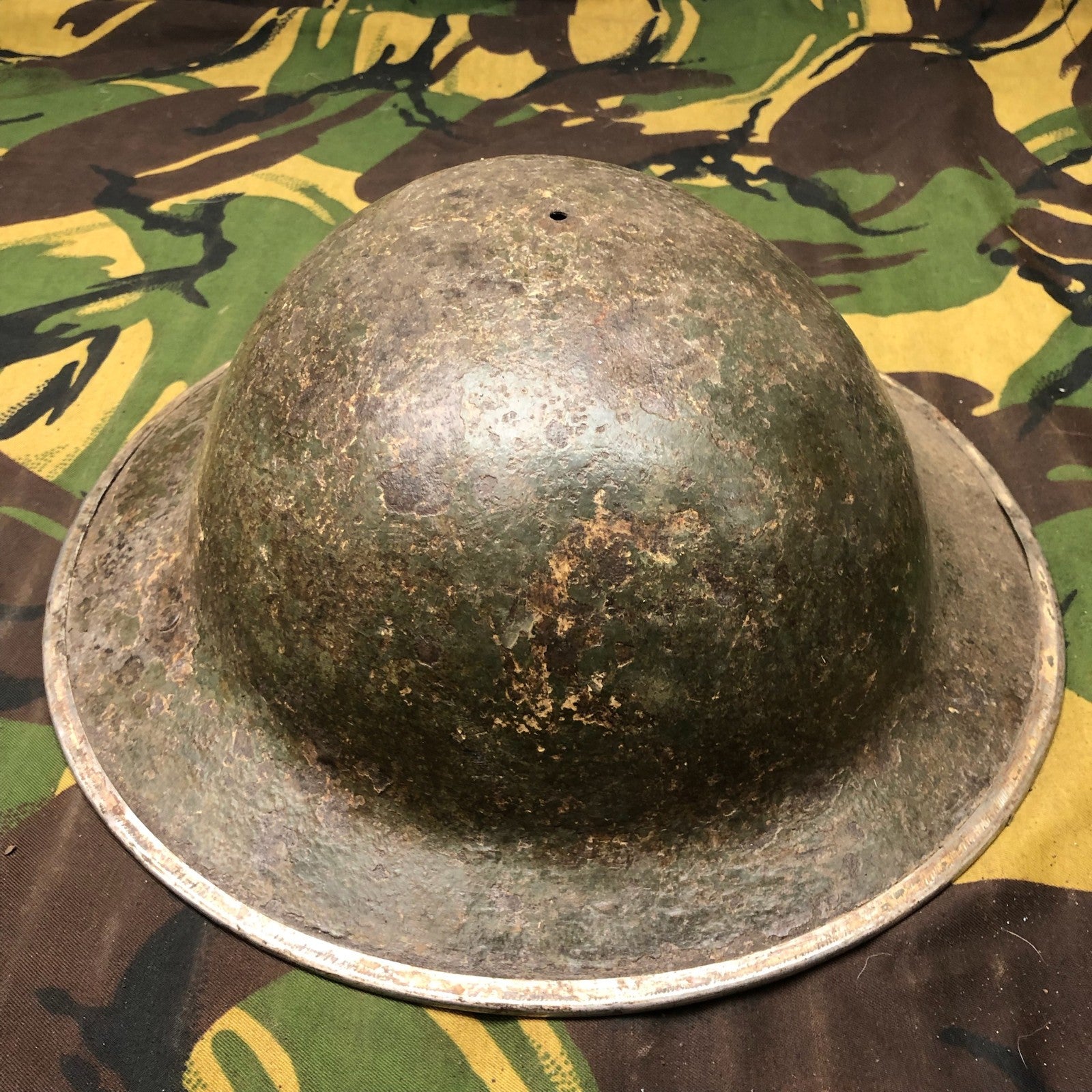 Original WW2 British Army Mk2 Brodie Combat Helmet - This example was produced in South Africa and has the 3 holes around the edge for the sun visor.