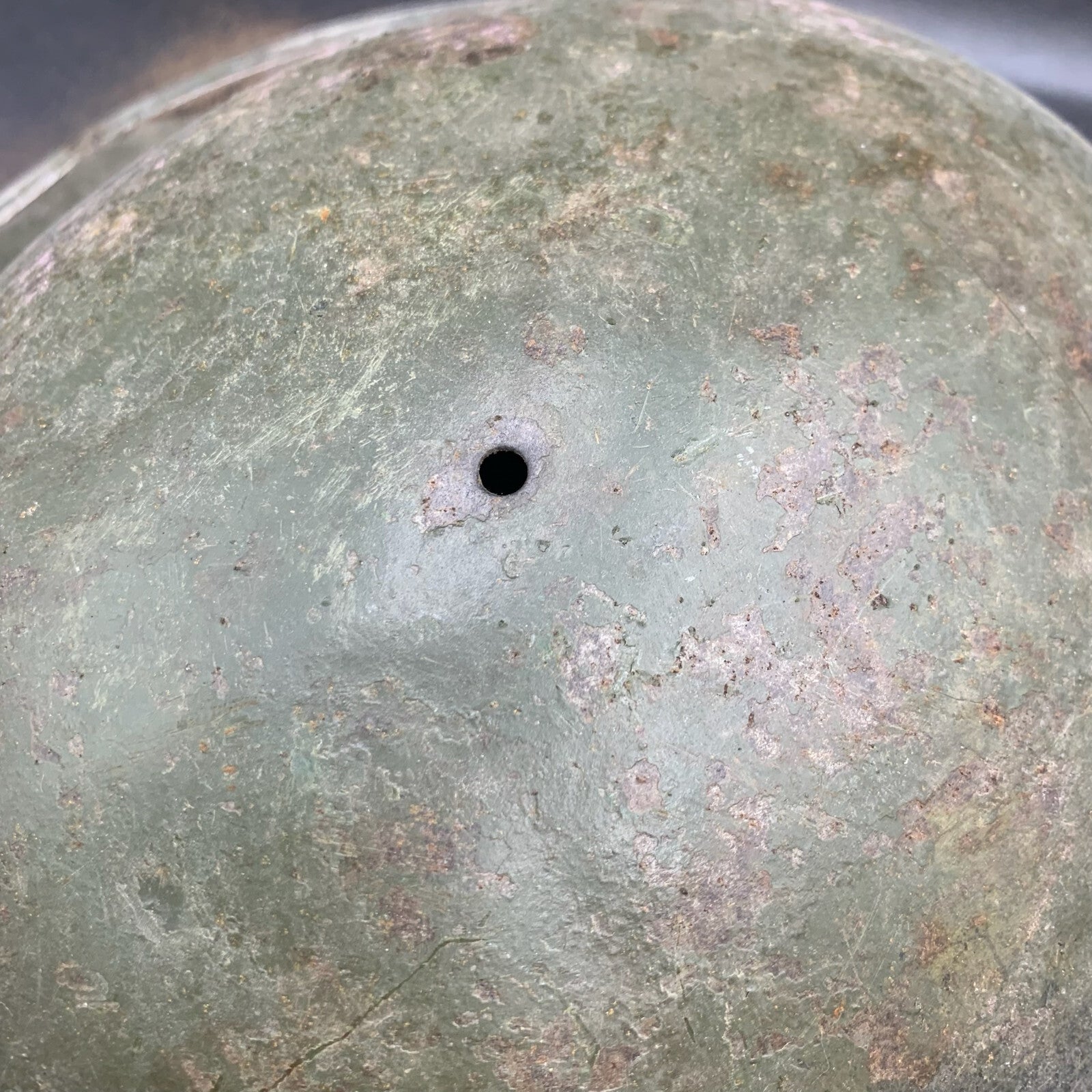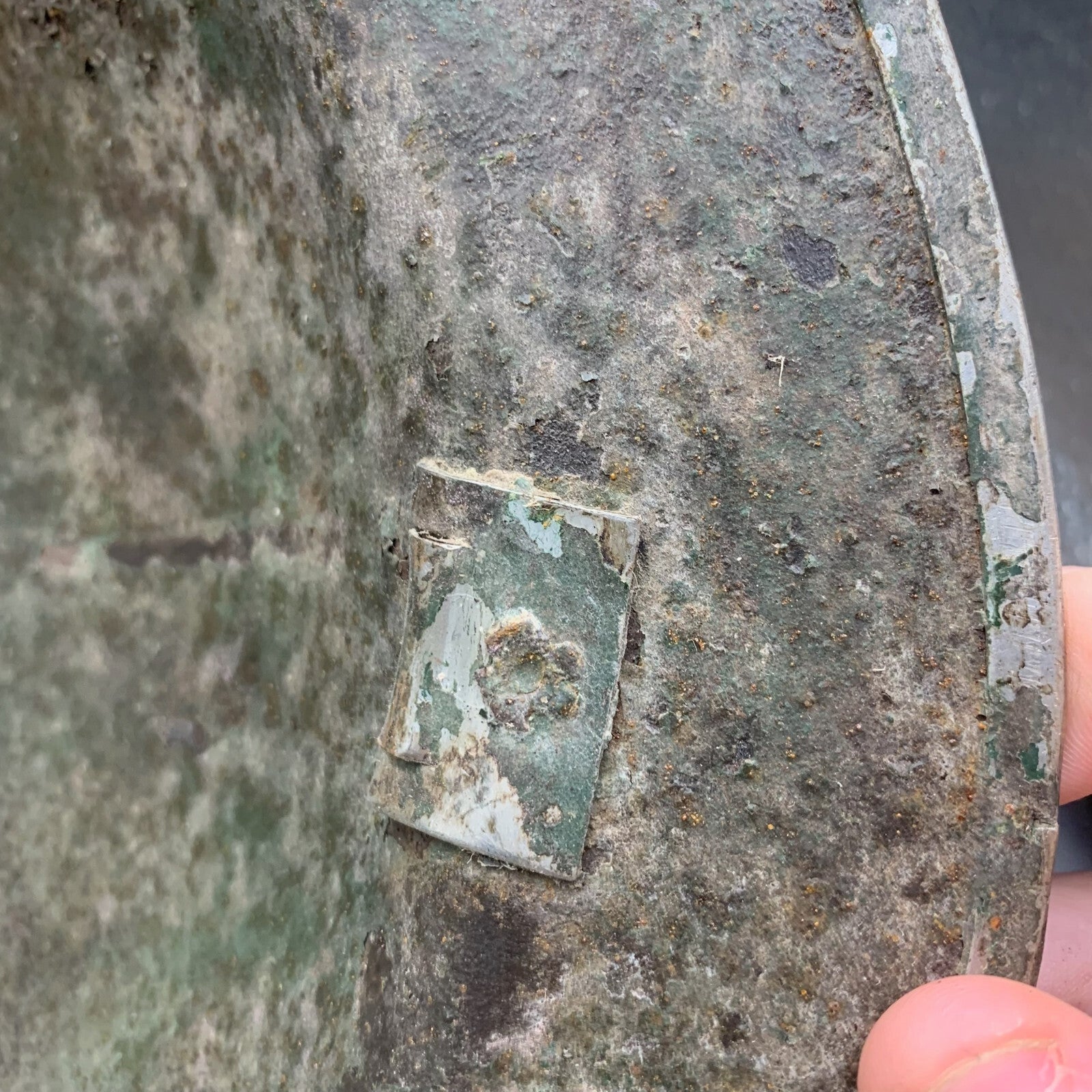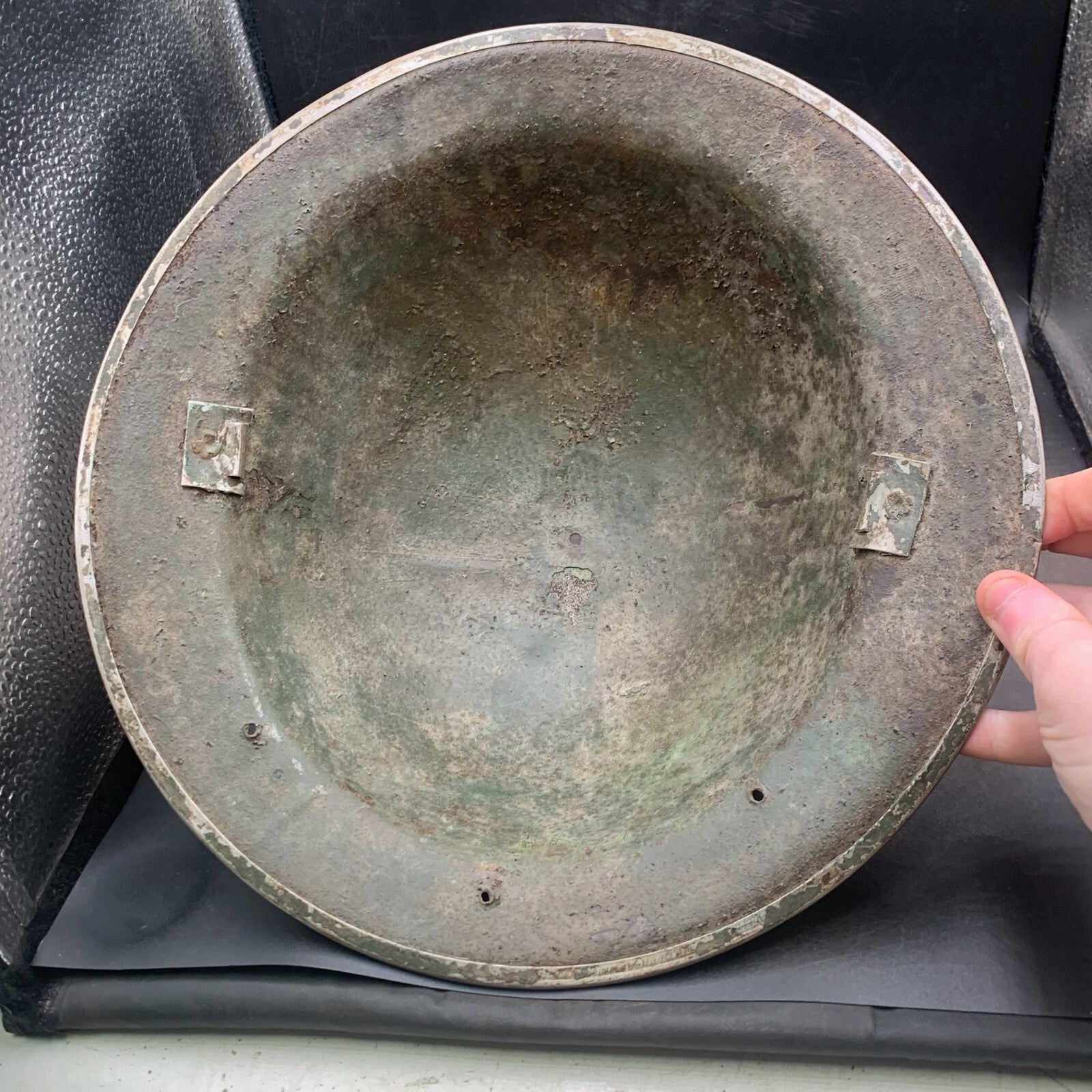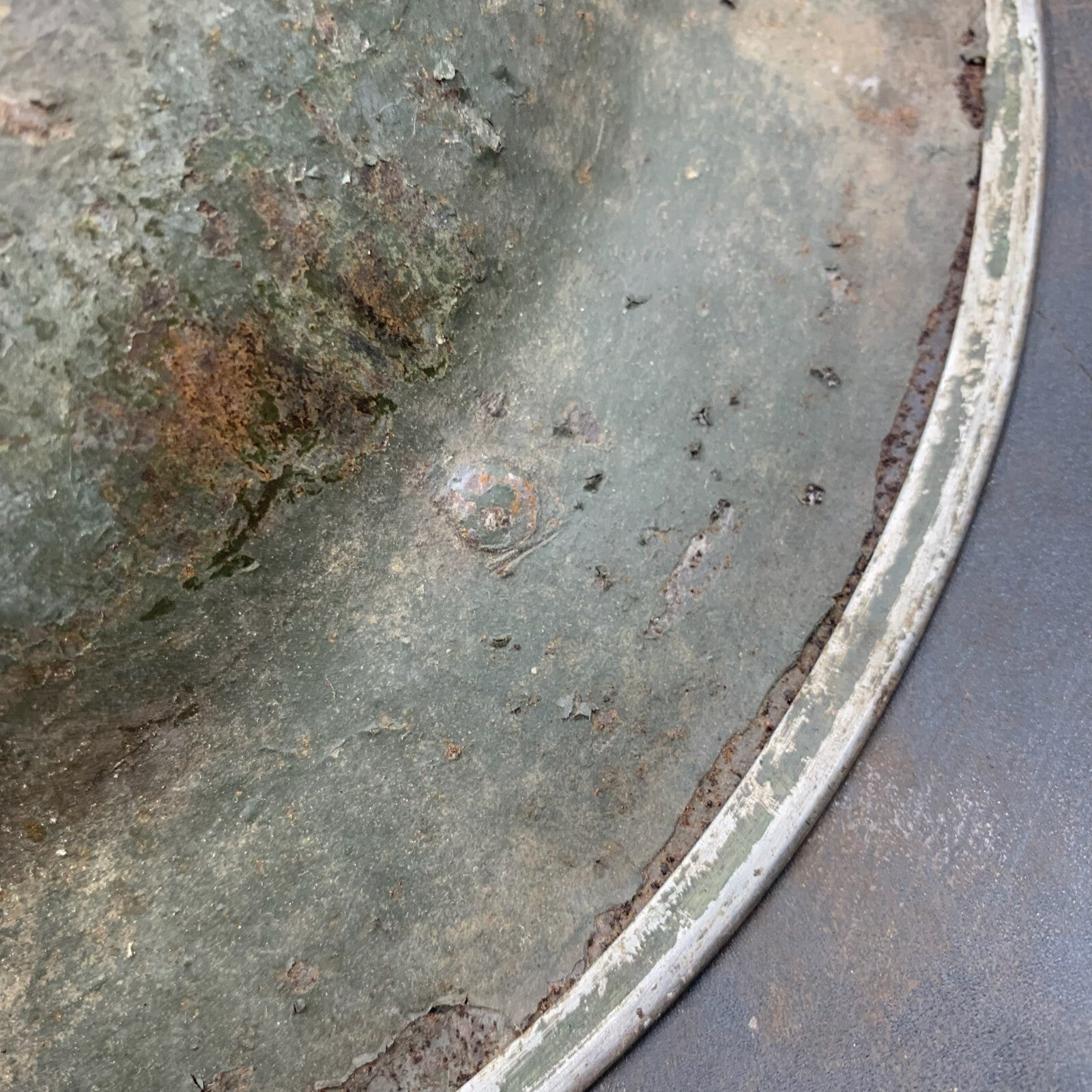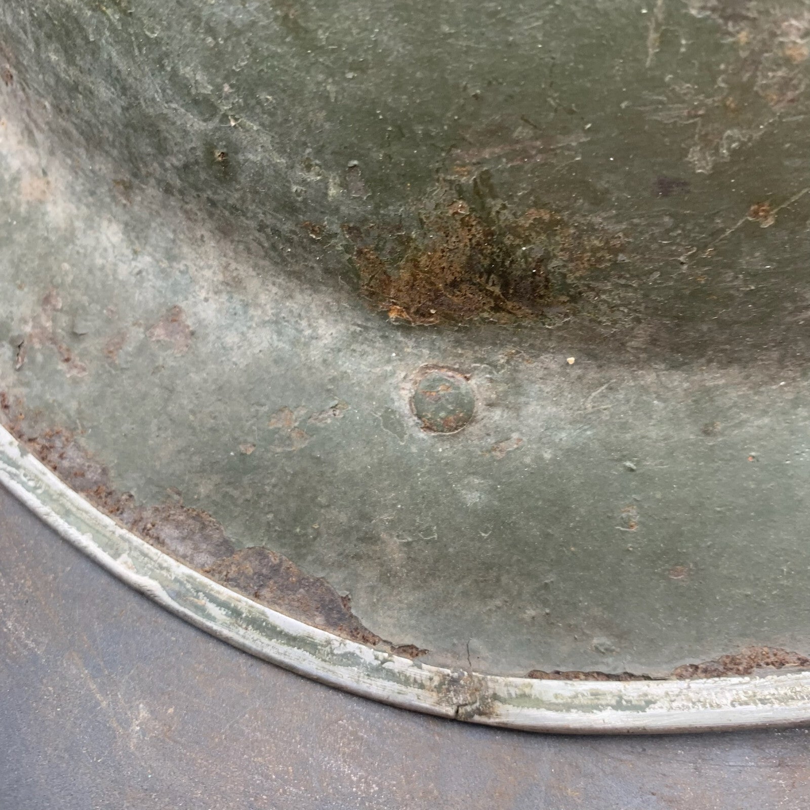 This example was manufactured in South Africa, this can be seen by the 3 holes at the rear edge for the neck sun guard worn during the Africa campaign.