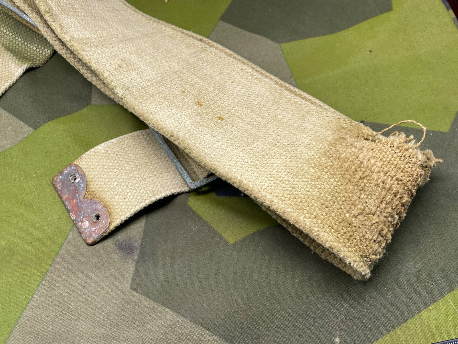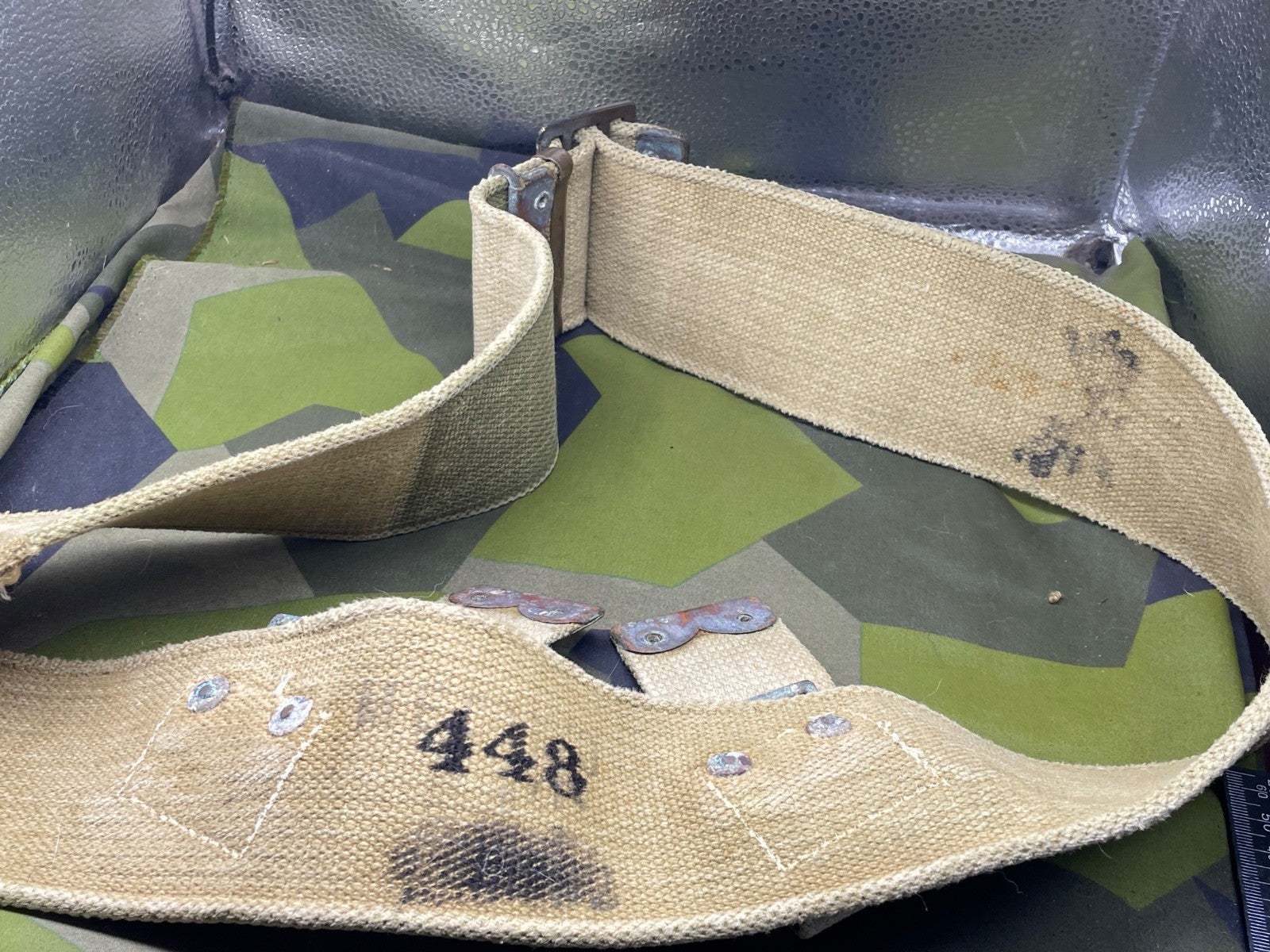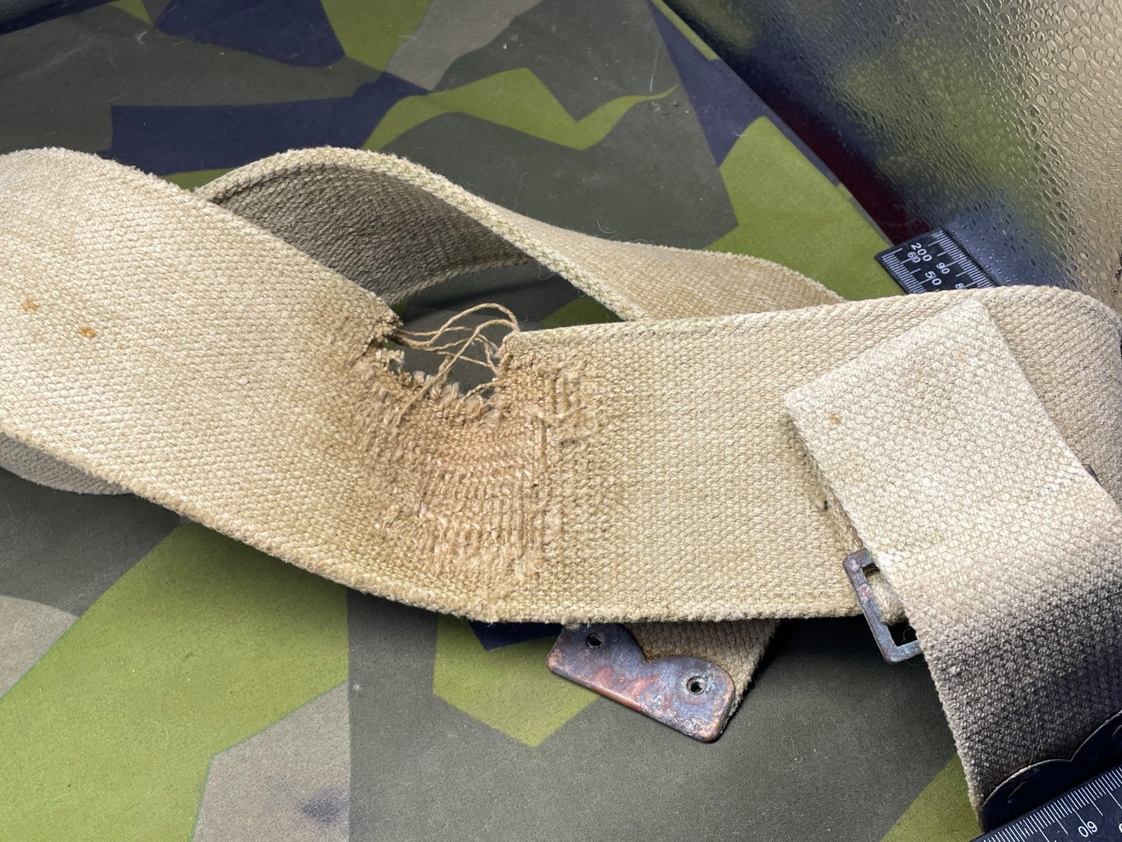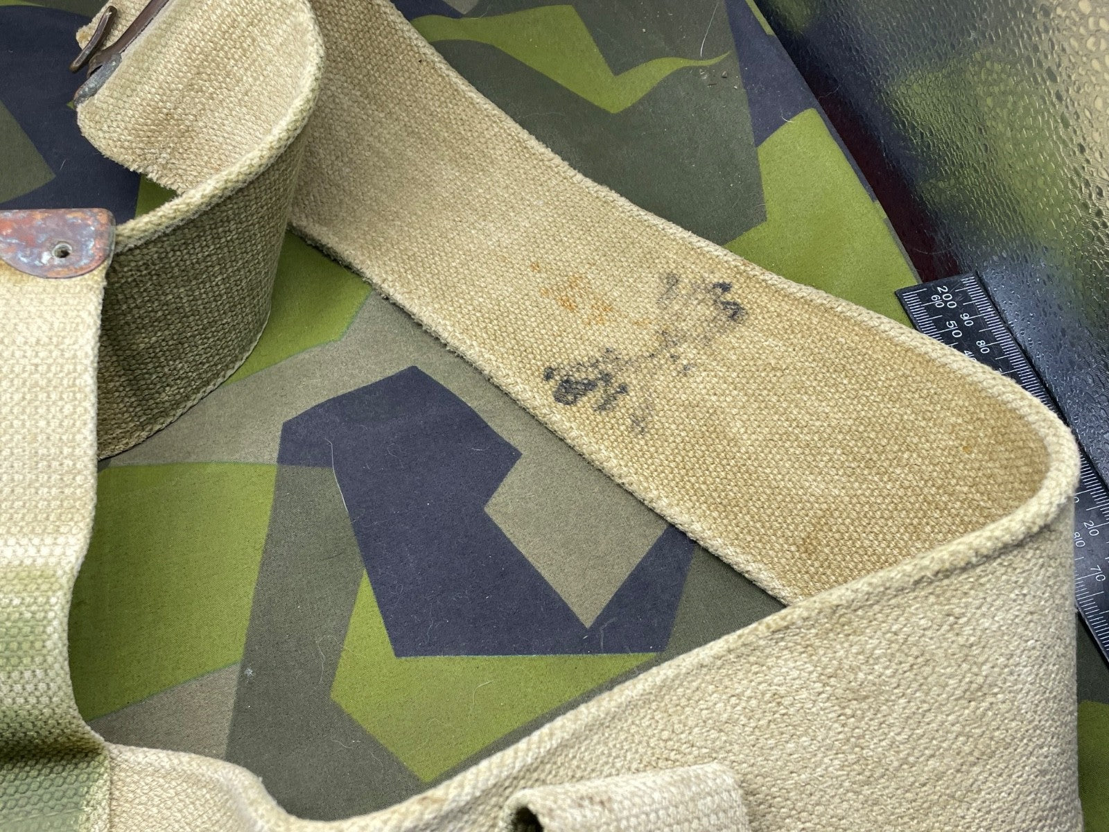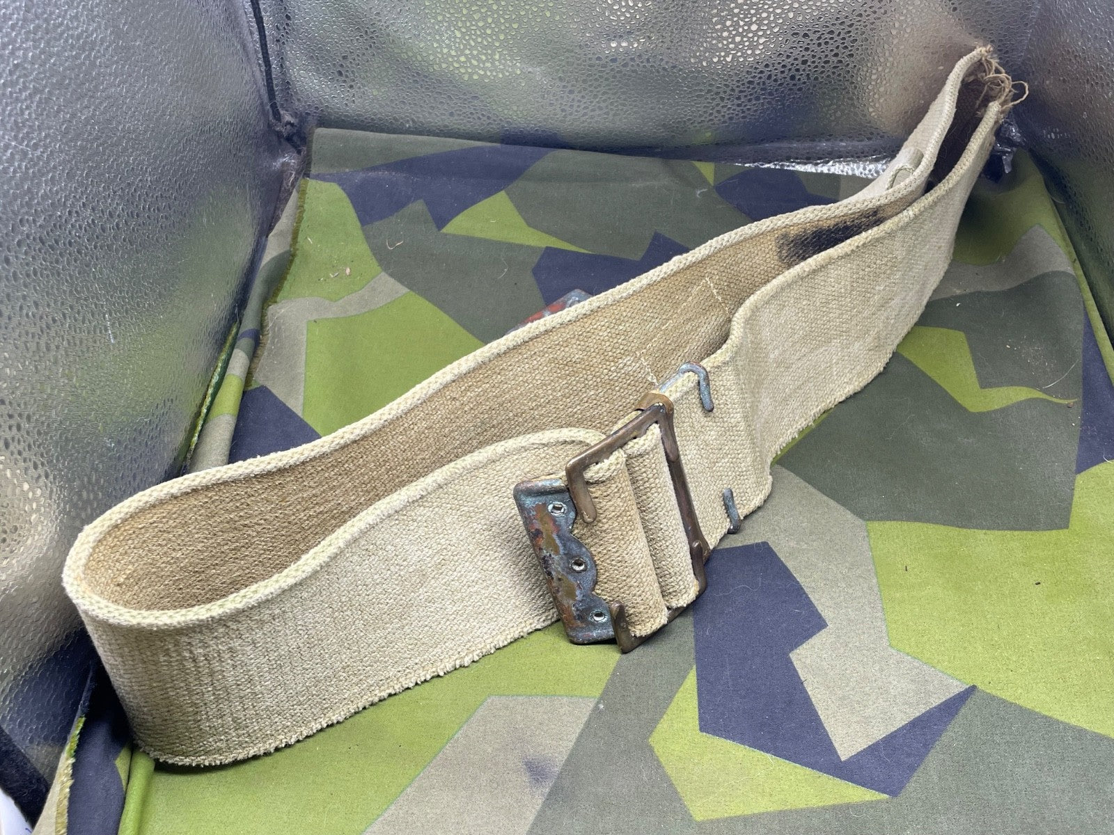 It has a lot of wear in one particular spot - probably from equipment rubbing against it. It could easily be hidden by an entrenching tool cover or a frog etc. It is priced accordingly.