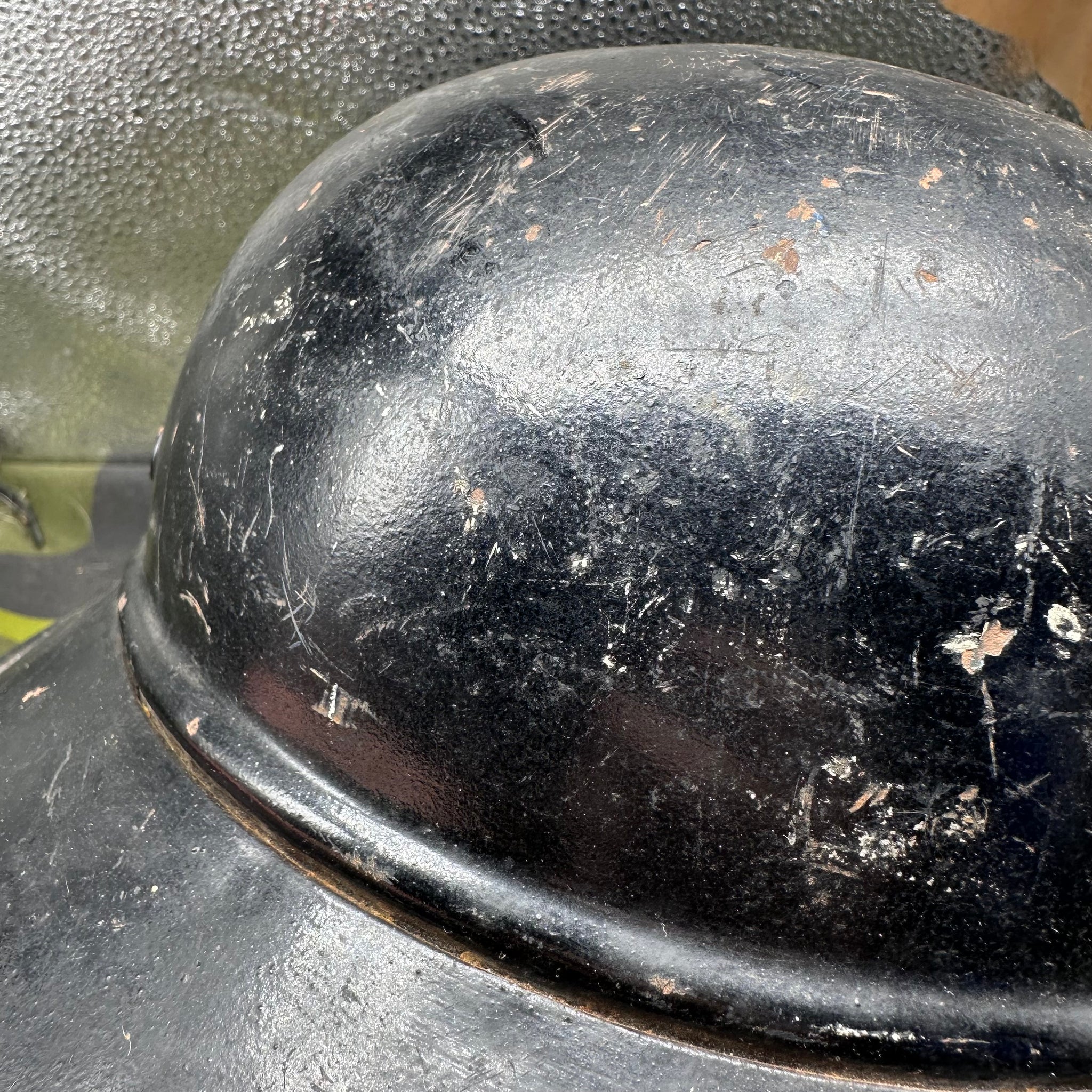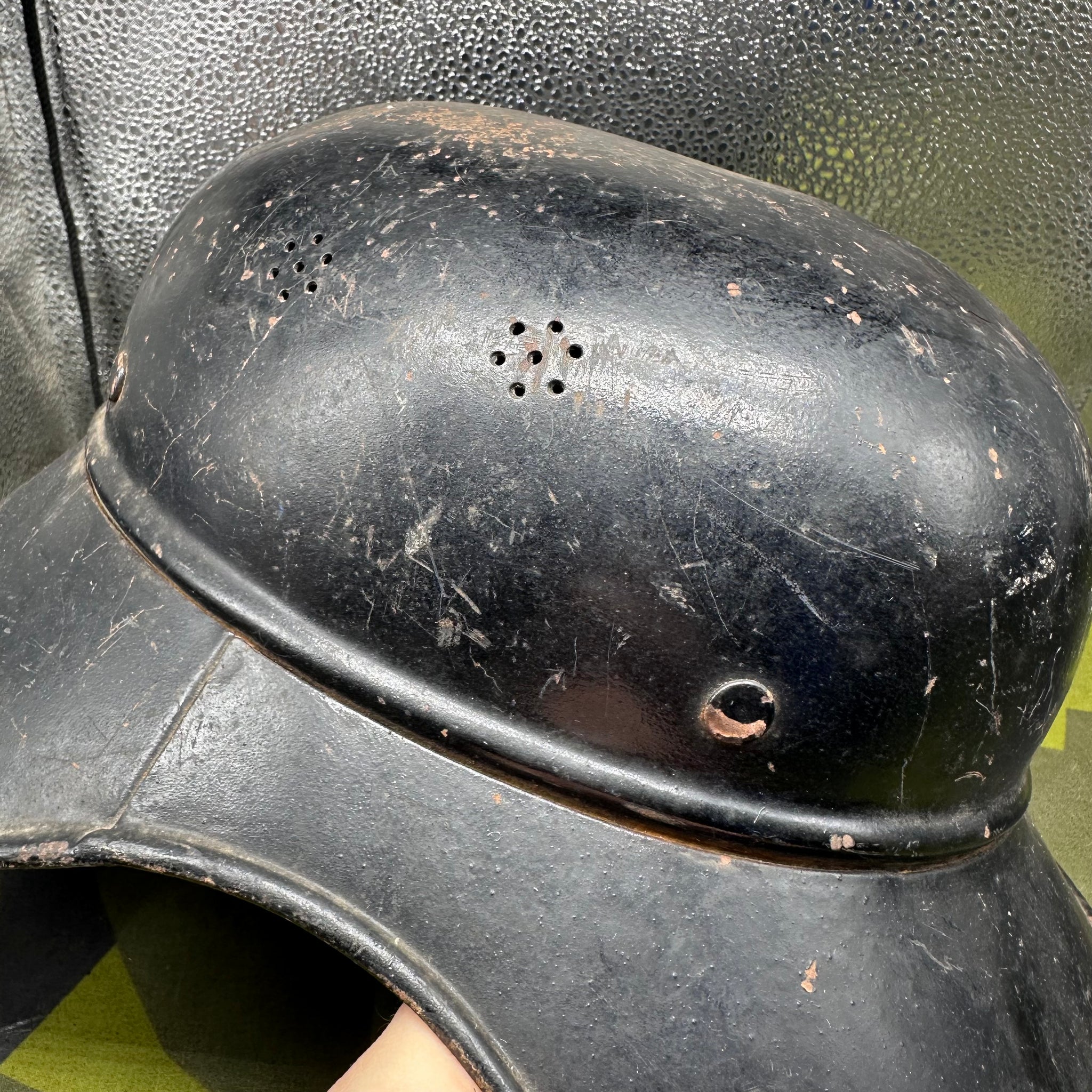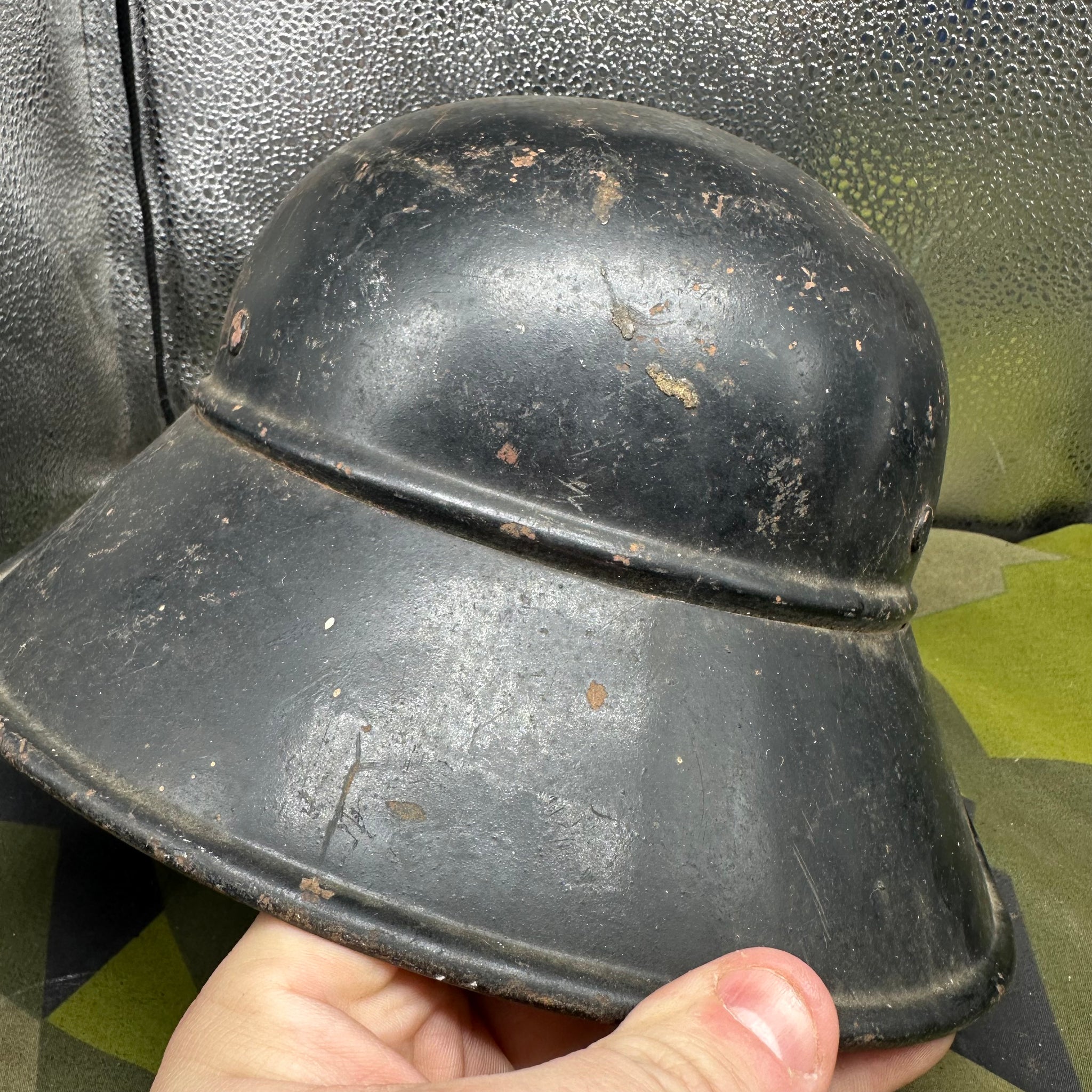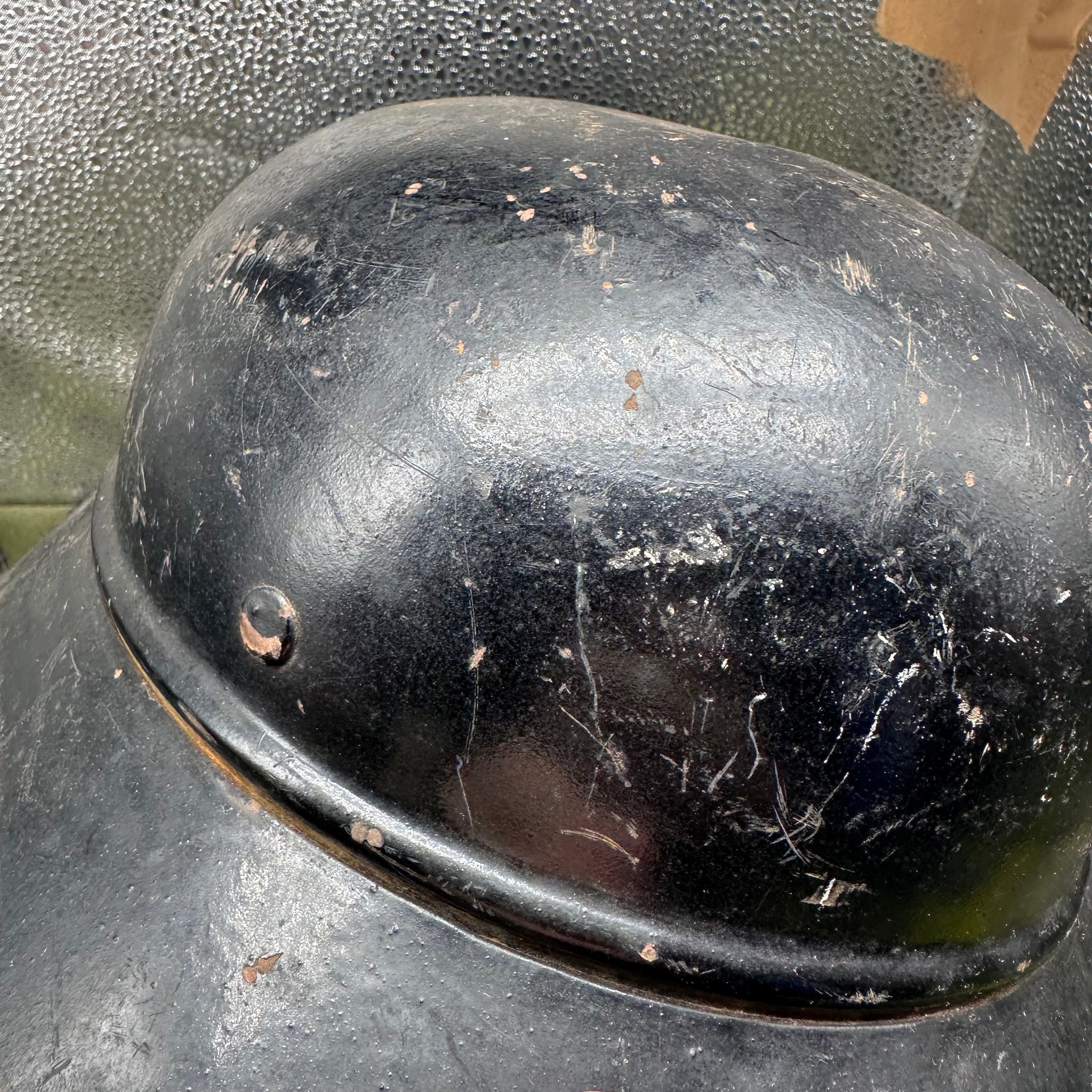 Just a lovely all around original luftshutz helmet. You can see where the decal is underneath the second layer of paint. Likely done late WW2 when it its been reissued.