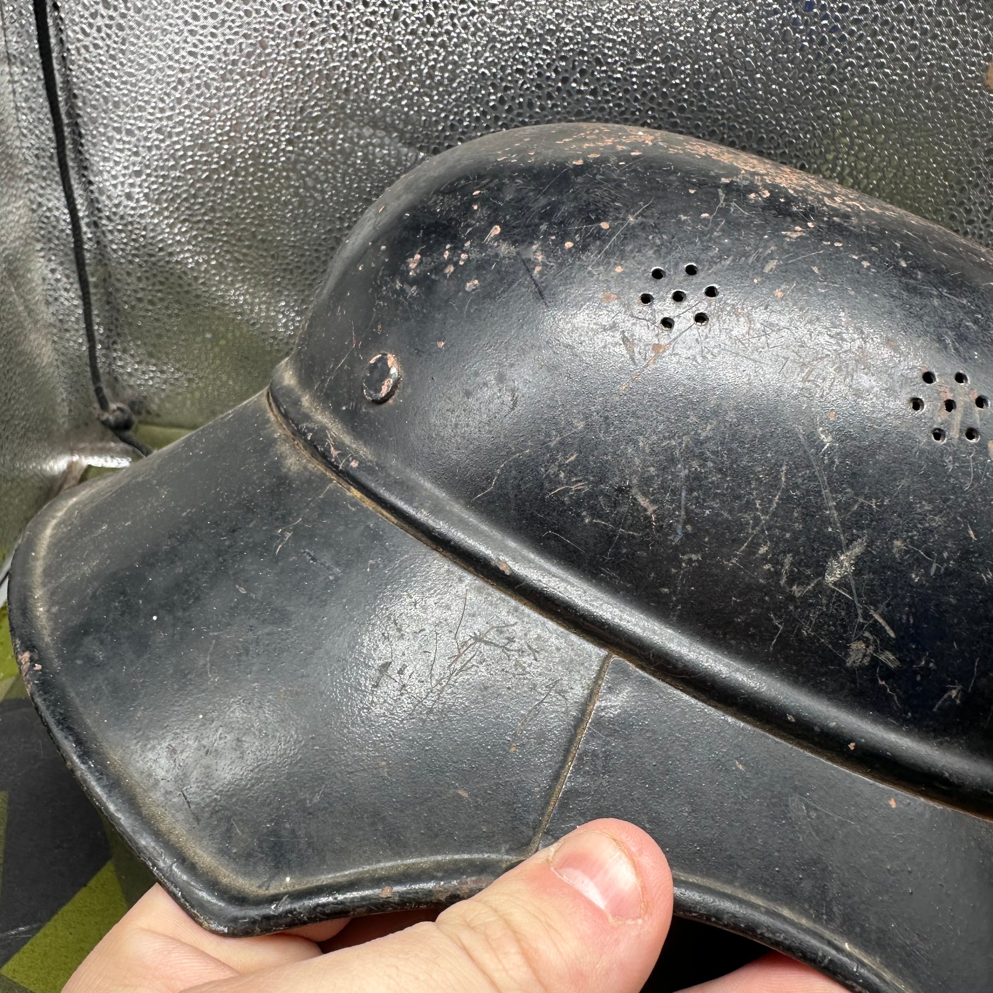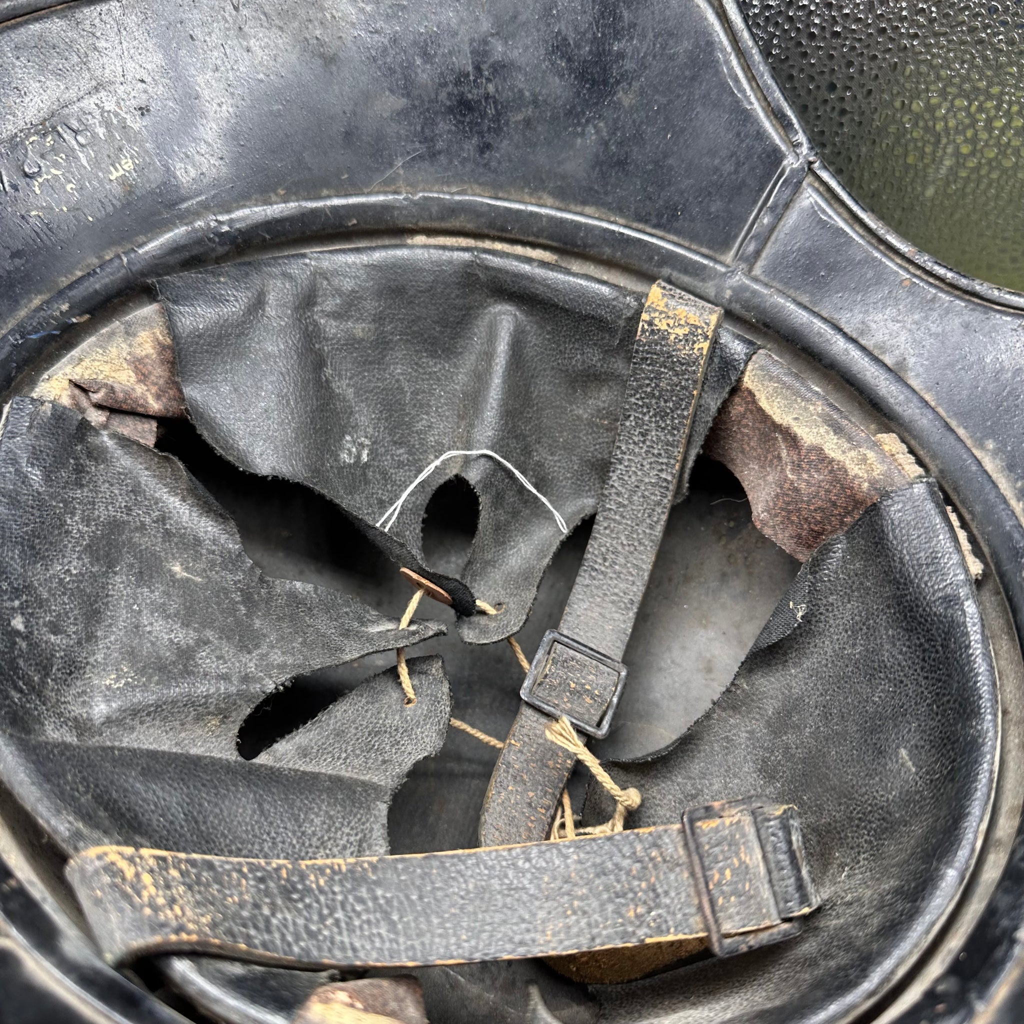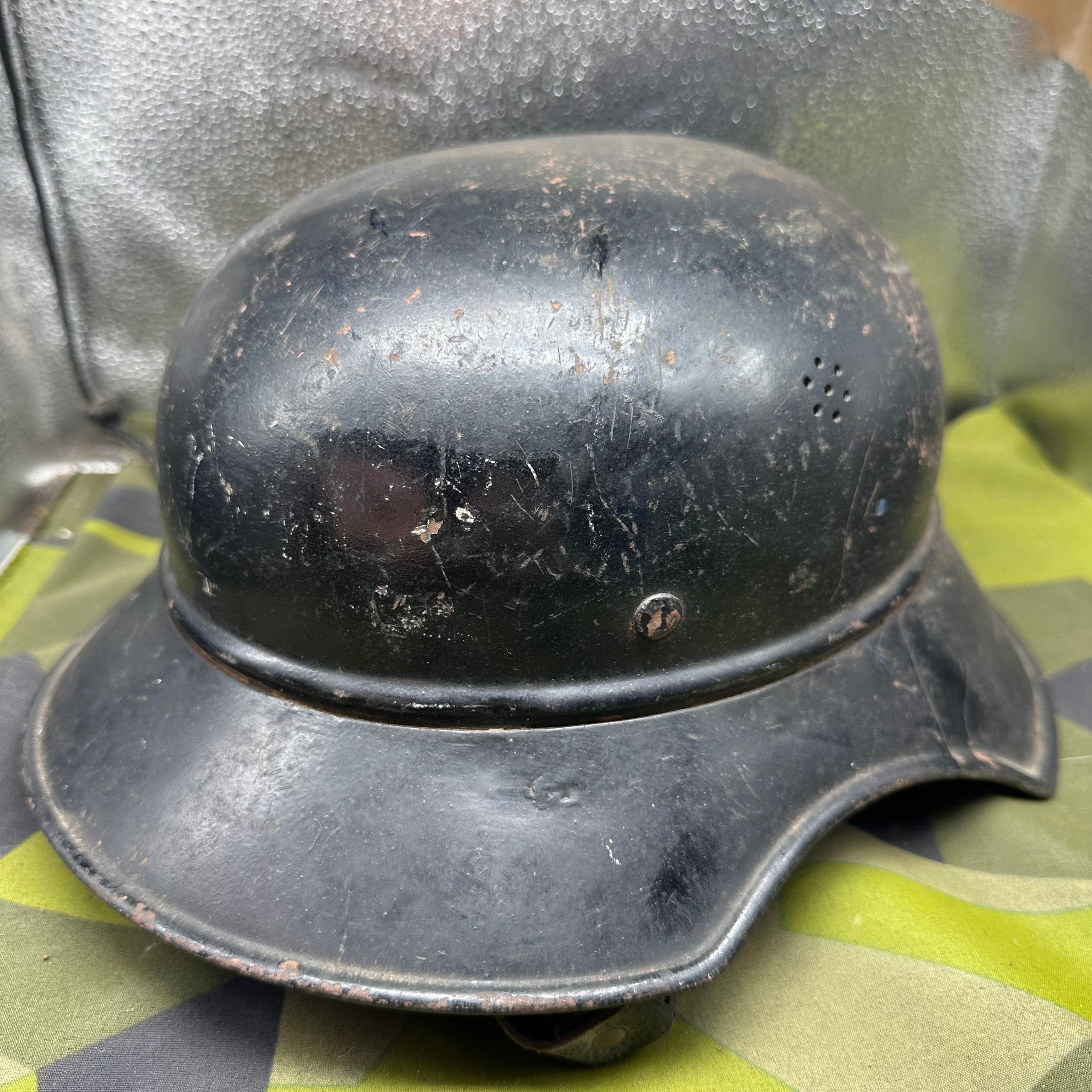 Just a lovely all around original luftshutz helmet. You can see where the decal is underneath the second layer of paint. Likely done late WW2 when it its been reissued.