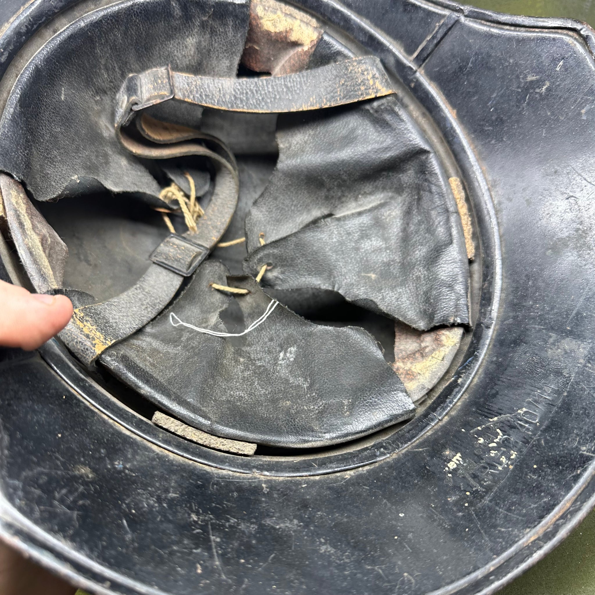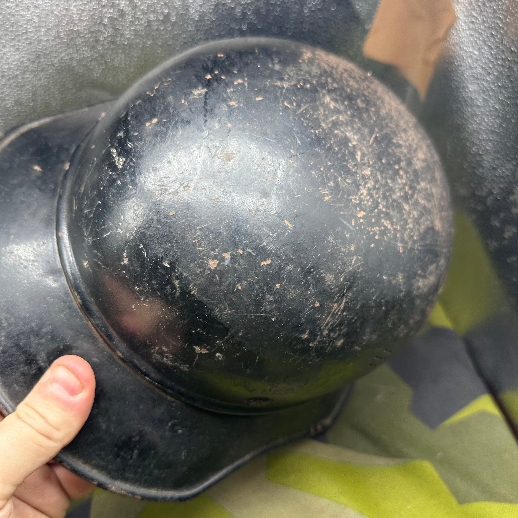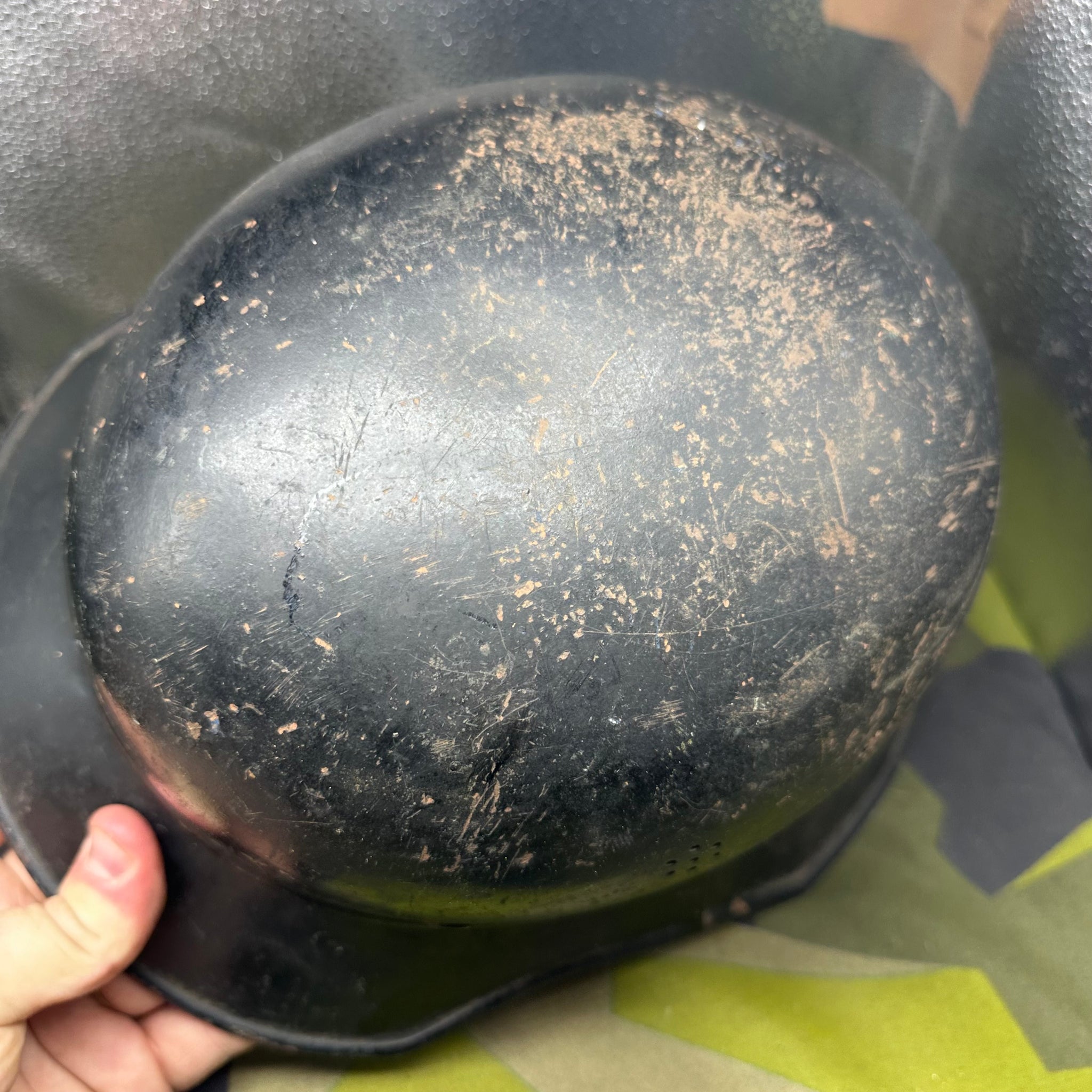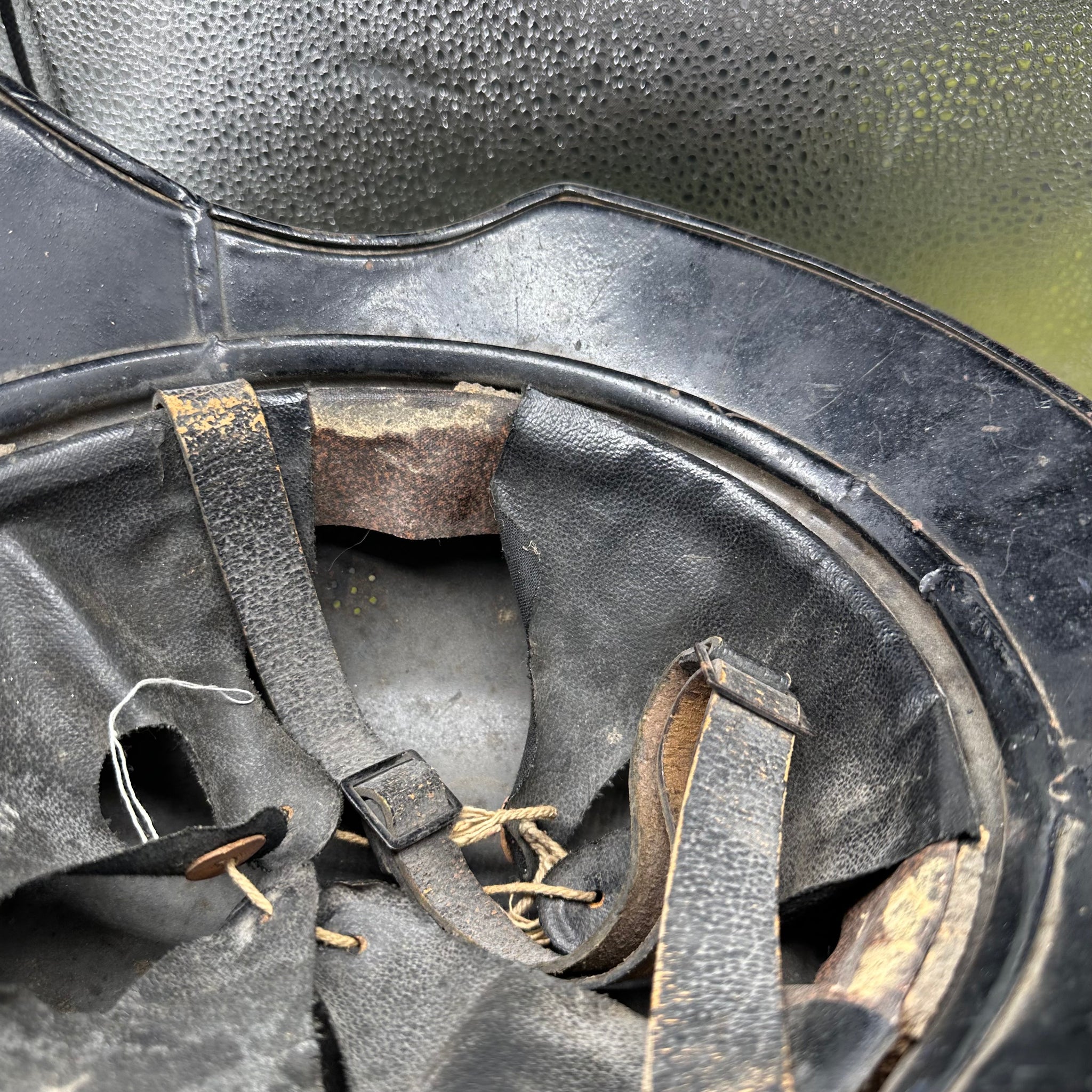 Just a lovely all around original luftshutz helmet. You can see where the decal is underneath the second layer of paint. Likely done late WW2 when it its been reissued.