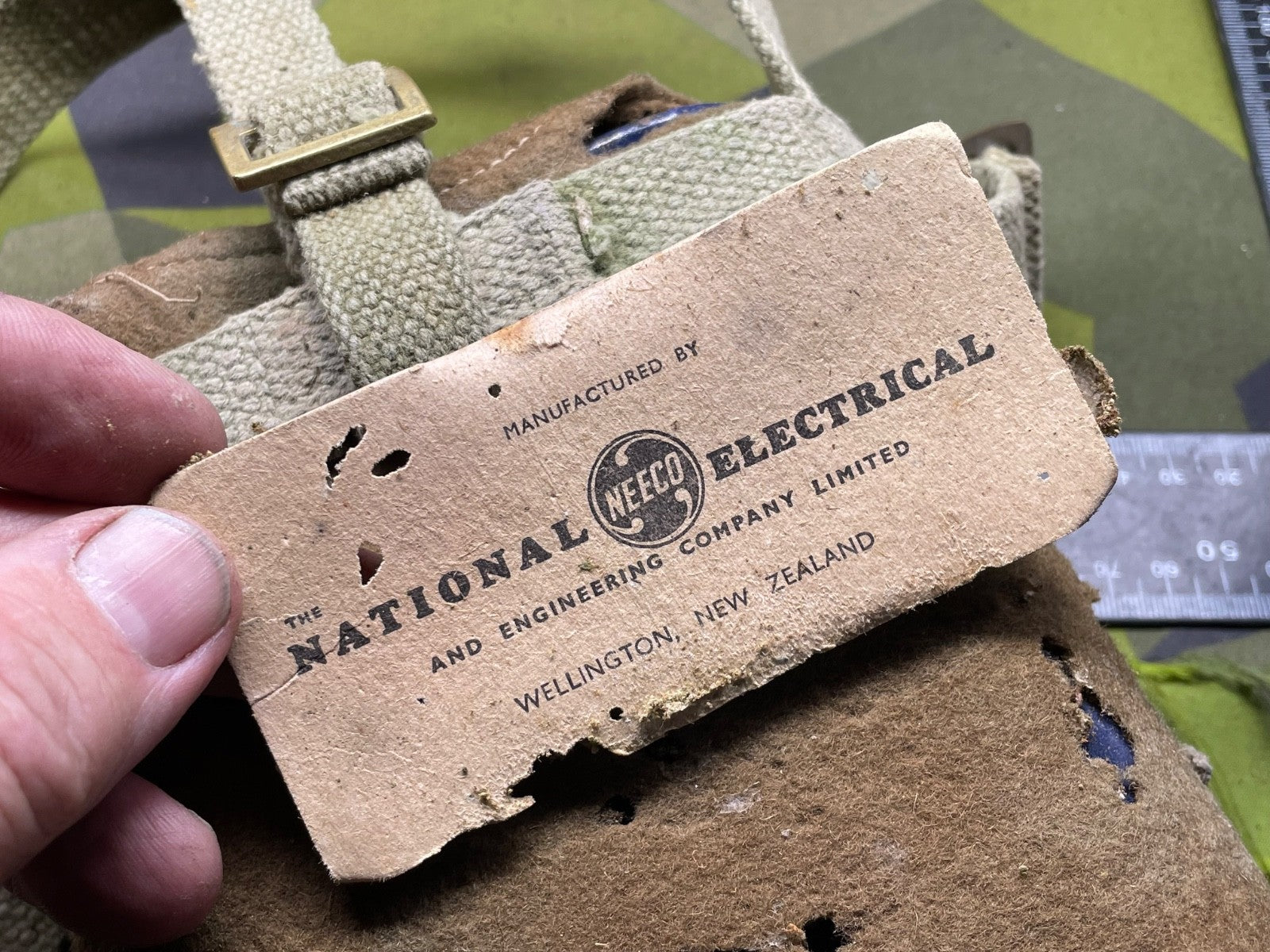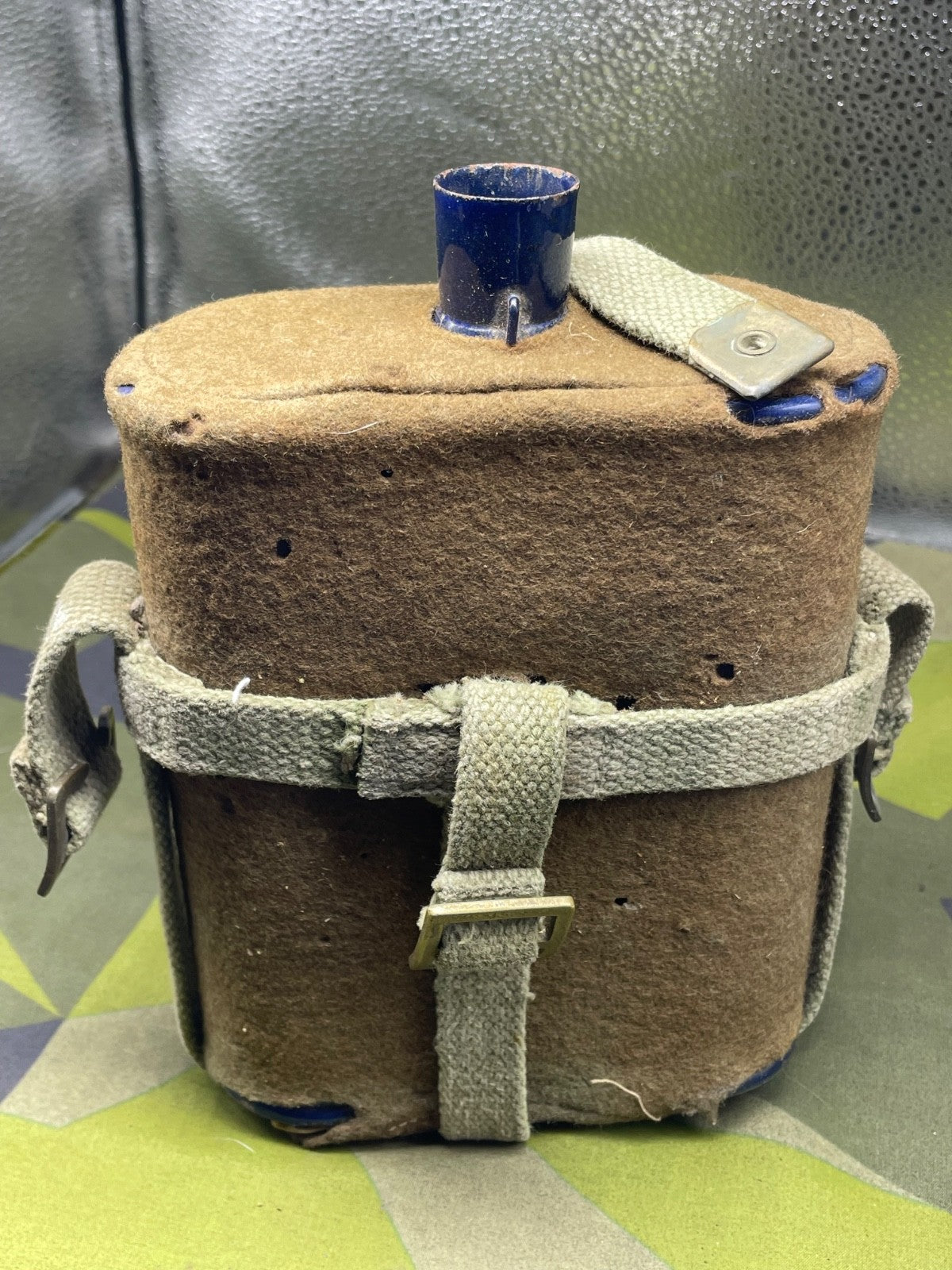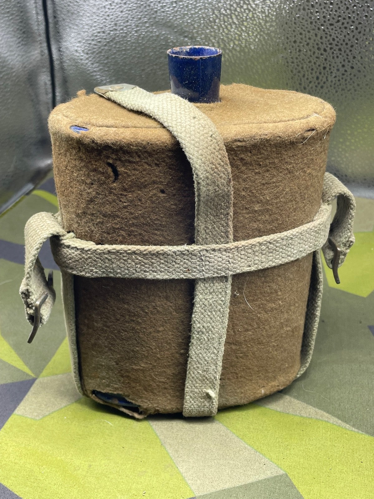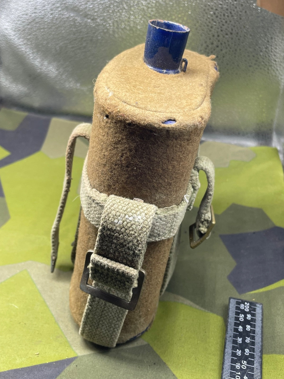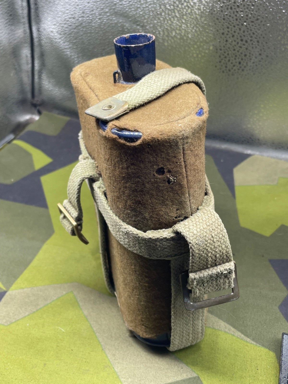 Original WW2 New Zealand Army Waterbottle in cradle with the original makers paper label still on the base.