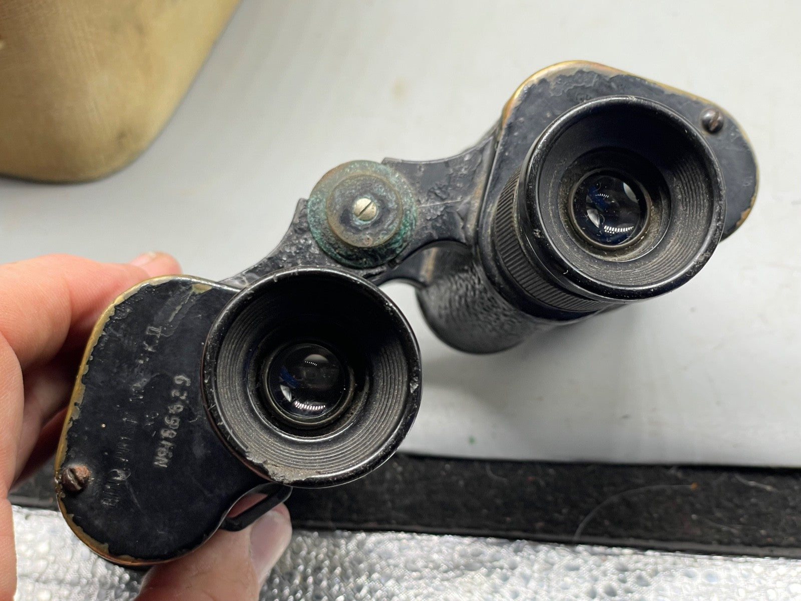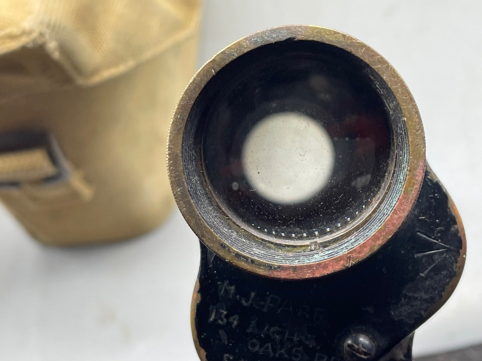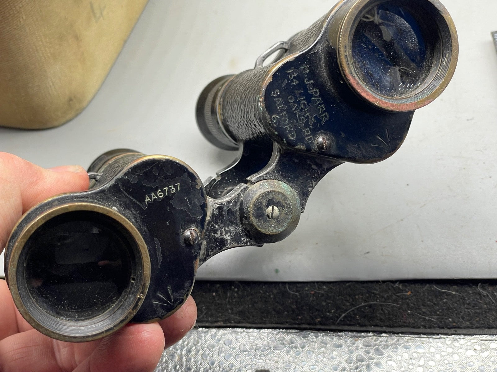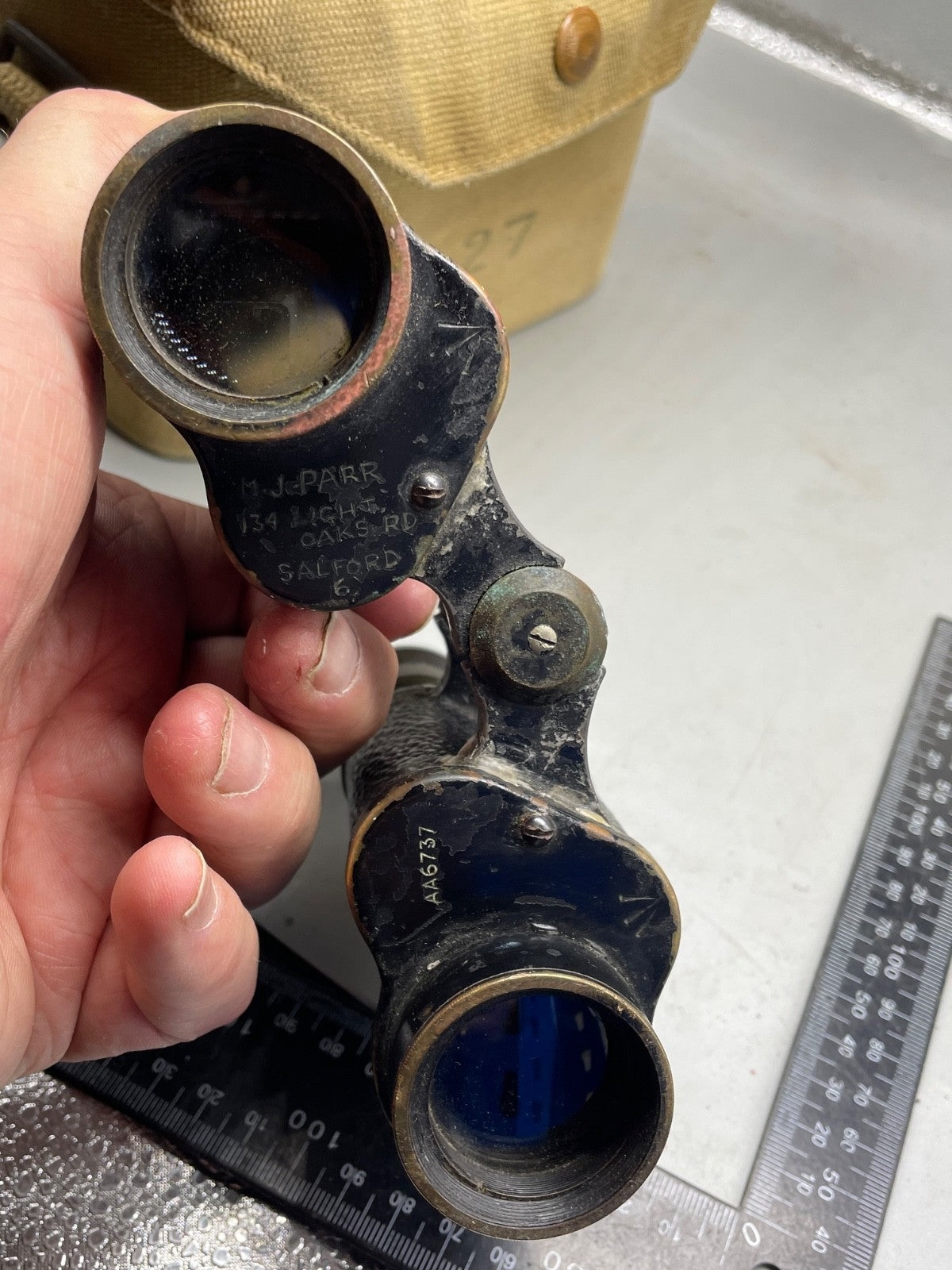 British Army issue Binoculars in 37 Pattern Case - WW2 Issue - 1943 Dated & Named to a J. Parr - 134 Light Oaks Road, Salford (Greater Manchester).  The lenses are dusty but undamaged.