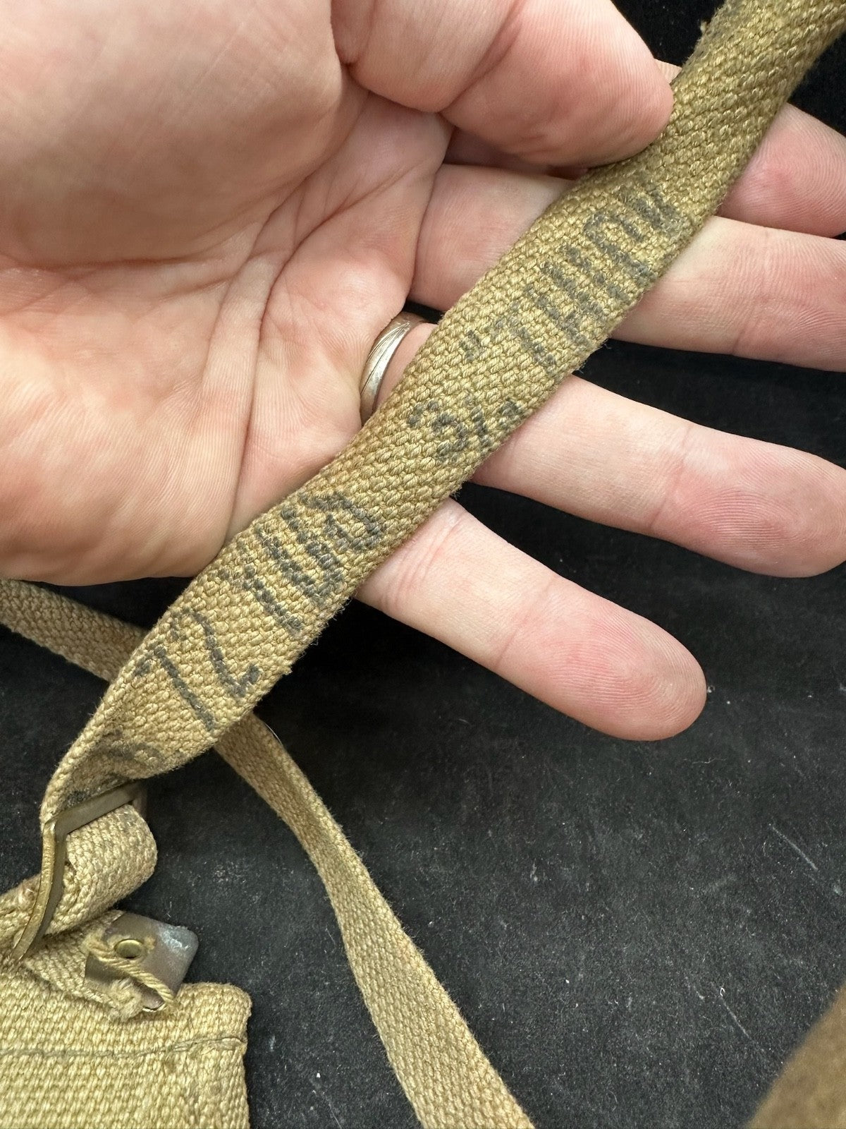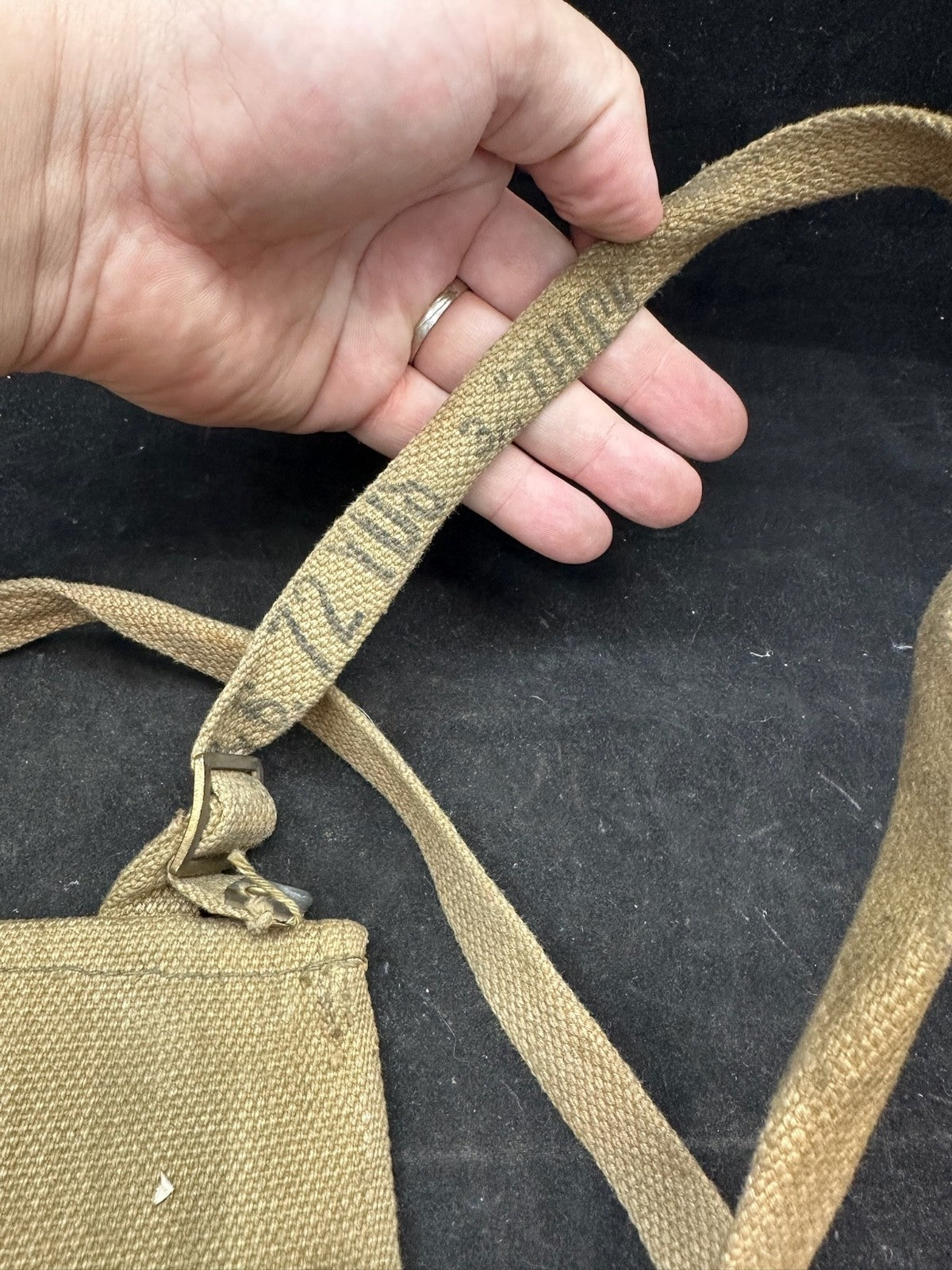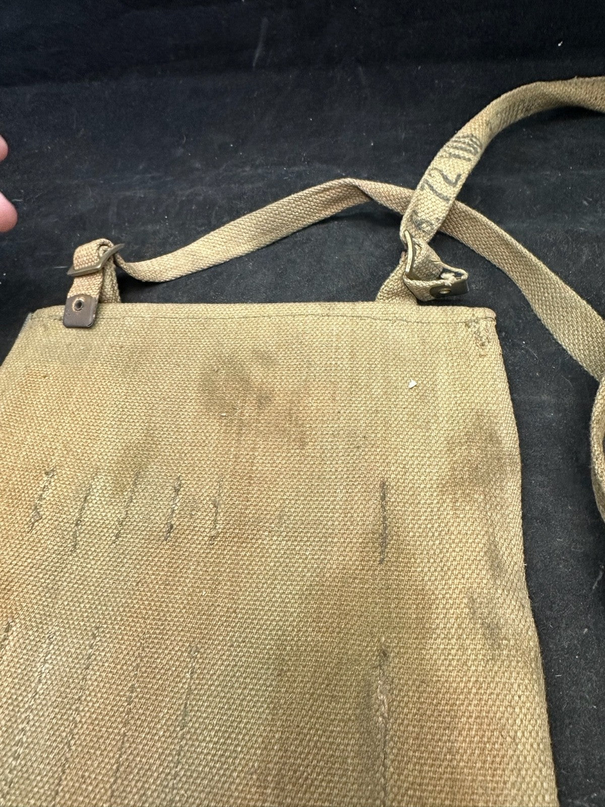 I love this ones markings, mainly because the shoulder strap is the end piece from manufacturing. It is well marked 72 yards from the original length of material. Just a cool thing!