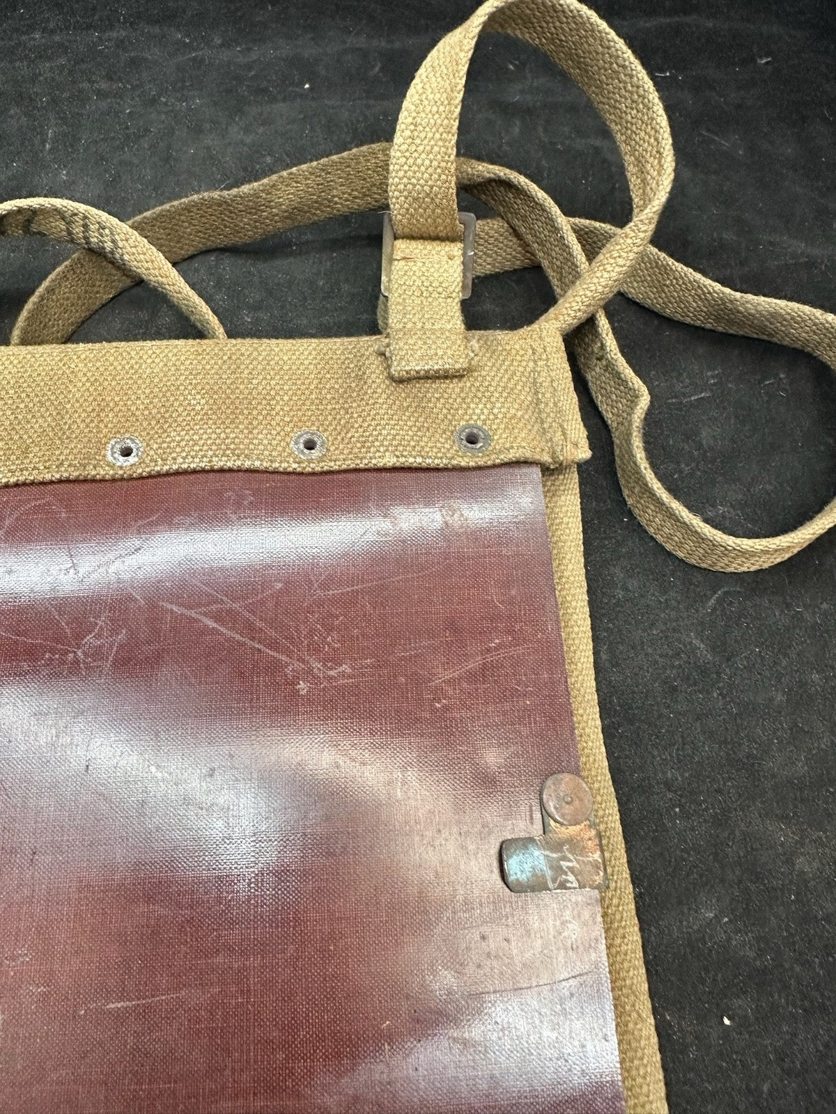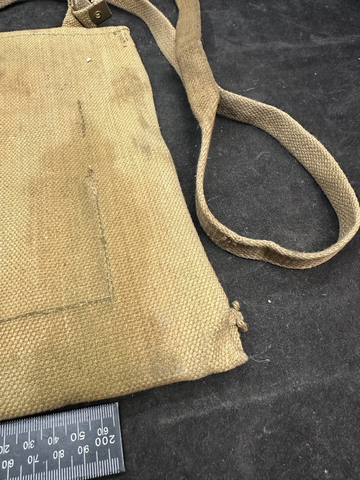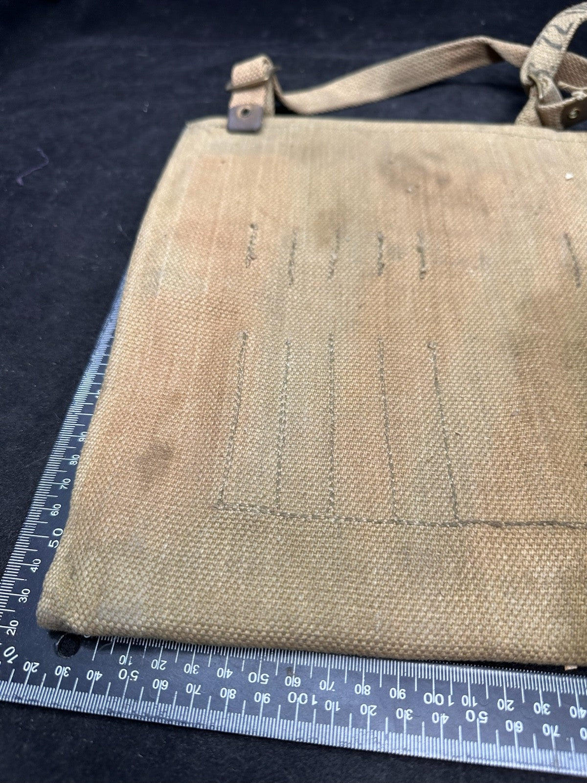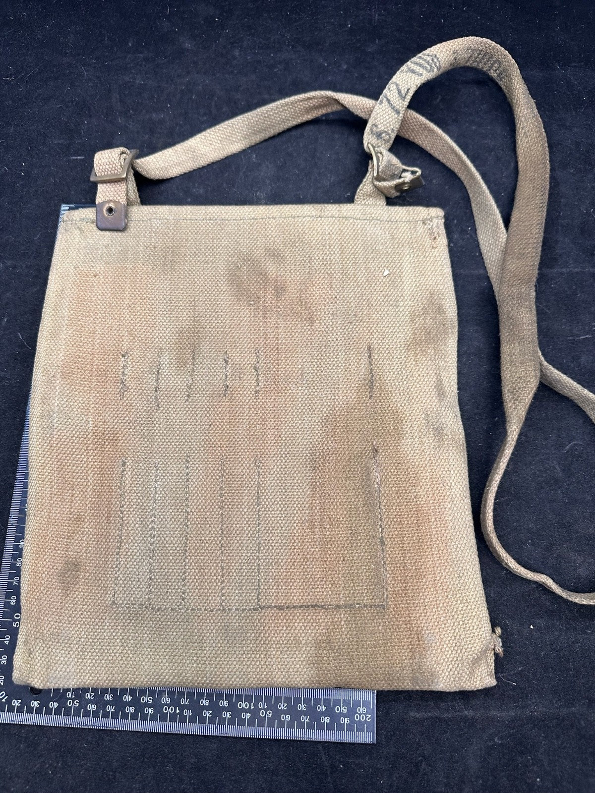 I love this ones markings, mainly because the shoulder strap is the end piece from manufacturing. It is well marked 72 yards from the original length of material. Just a cool thing!