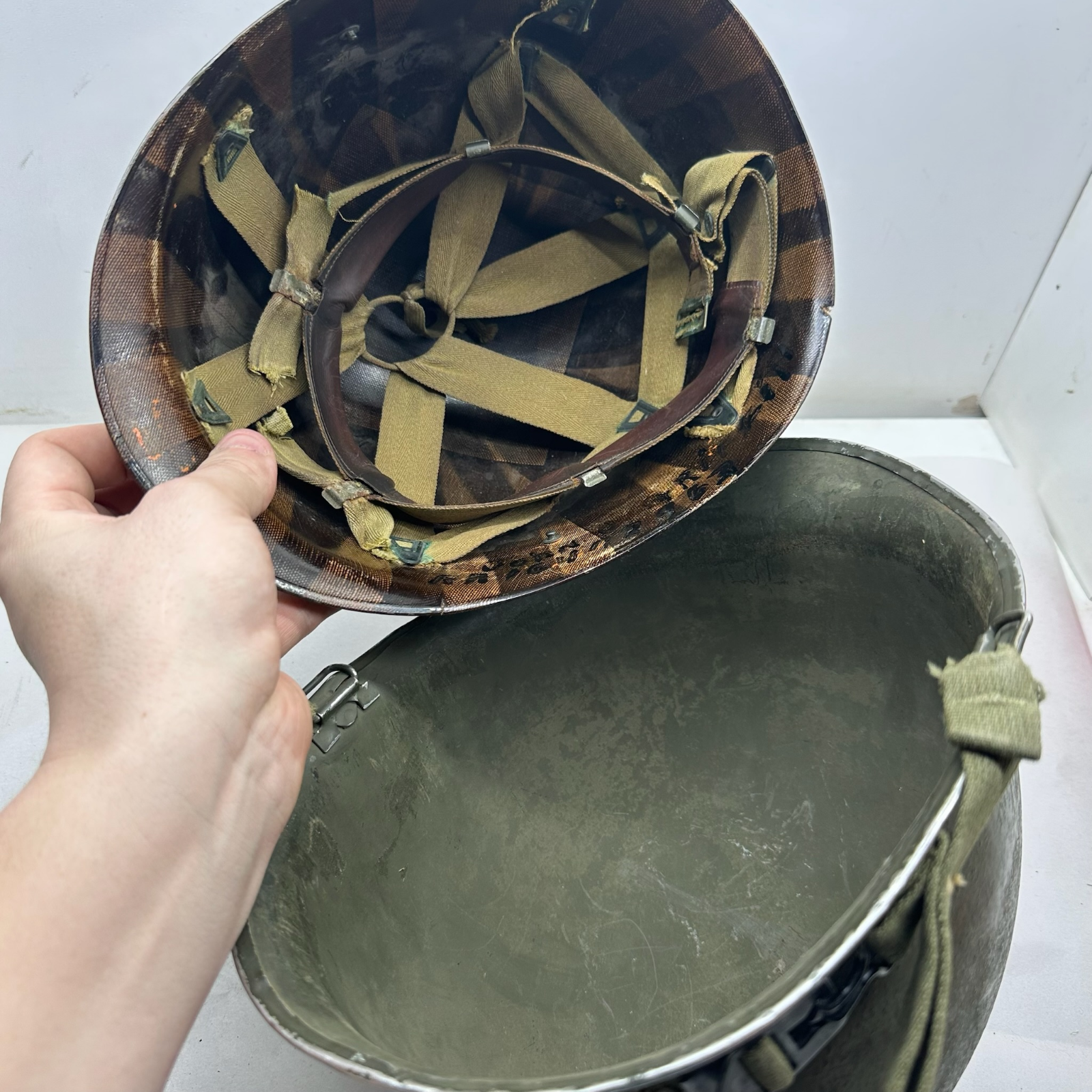 The liner needs a little bit of work, but its a lovely untouched original WW2 helmet overall!
